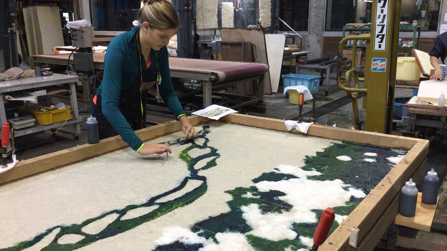 Pulp painting is a unique process that emerged from traditional Japanese papermaking. This medium is flexible and results are highly stylized, closely reflecting the maker’s hand. I love this expressive medium. Awagami Factory is unique for facilitating experiments in large format papermaking. With sizable frameworks and custom vacuum tables meters in length, ambitious paper projects are possible and encouraged. Let the papermaking begin!