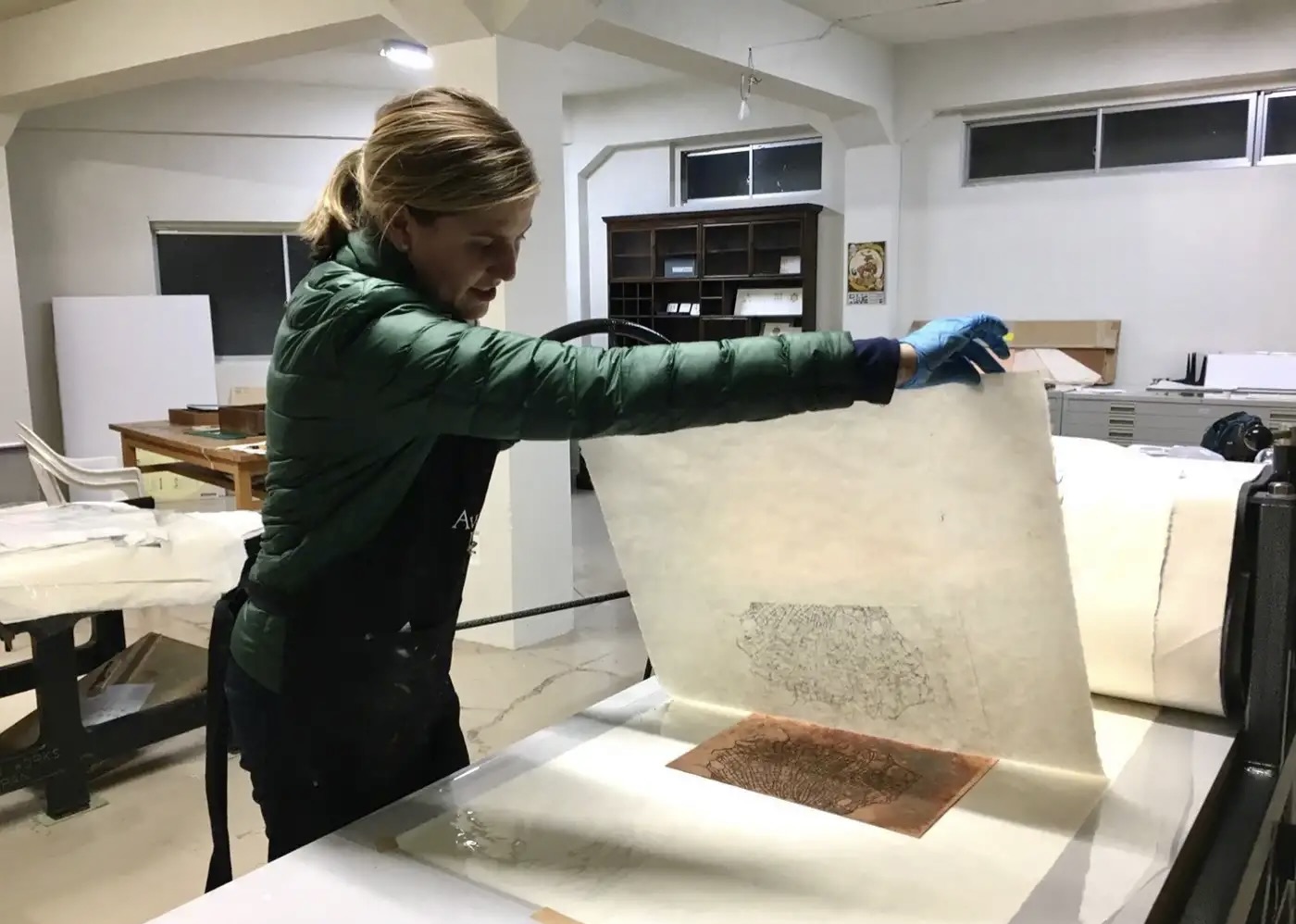 After working so hard to prepare, install, exhibit, and deinstall the show we are all fatigued, yet determined. Awagami staff continue their busy schedules and artists muster up enough energy to make a few more pieces. I retreat to the printmaking studio, just down the street from the Awagami Factory. With access to printing presses, copper, inks, and stacks of beautiful washi papers this is an opportunity I can’t pass up. I create etchings of web structures, tracing real webs onto plates for carving. Pulled an edition of 8 prints, entitled Traces: Kumo No Ito.