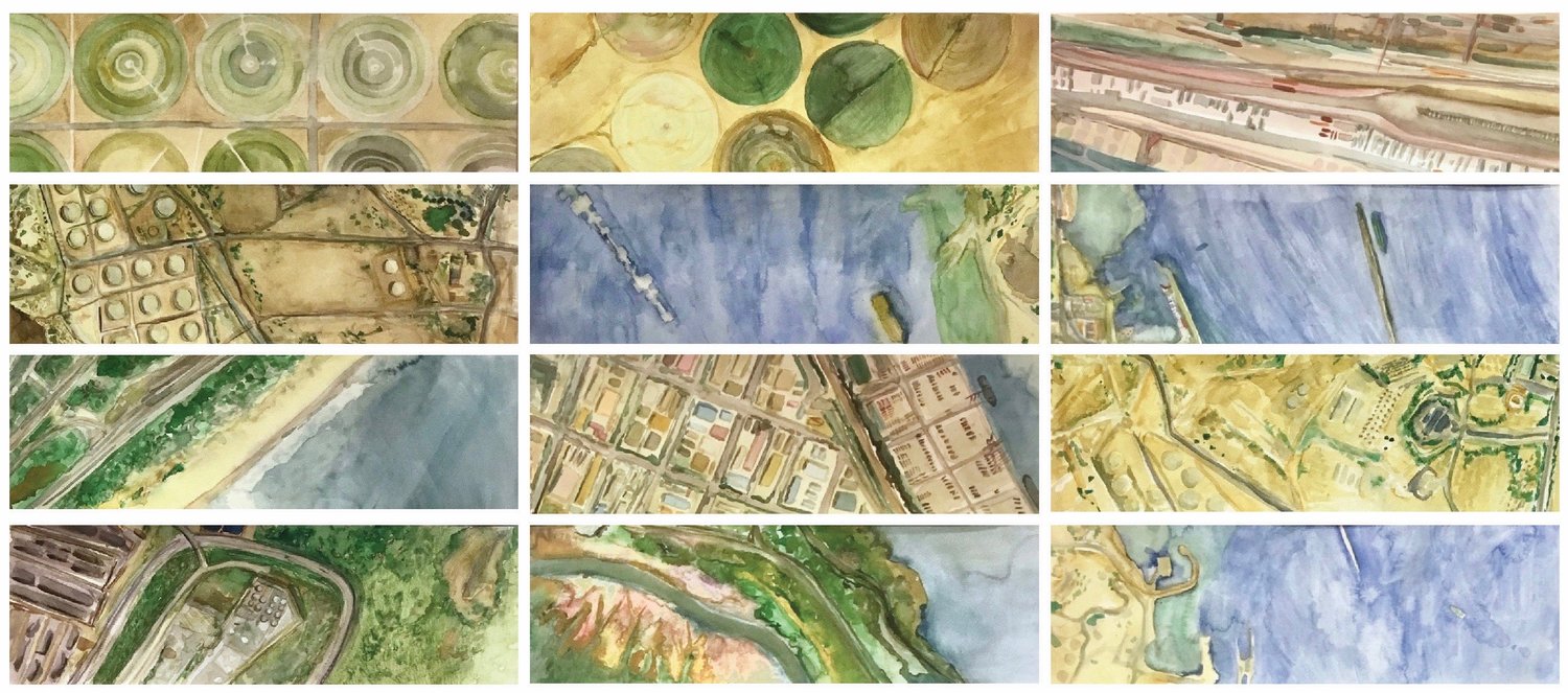 As my residency at Planet comes to a close, I made a series of watercolors based on SkySat imagery from Terra Bella (formerly Skybox Imaging), Planet’s subsidiary company. Terra Bella provides high-resolution Earth observation satellite imagery, high definition video and analytics services.