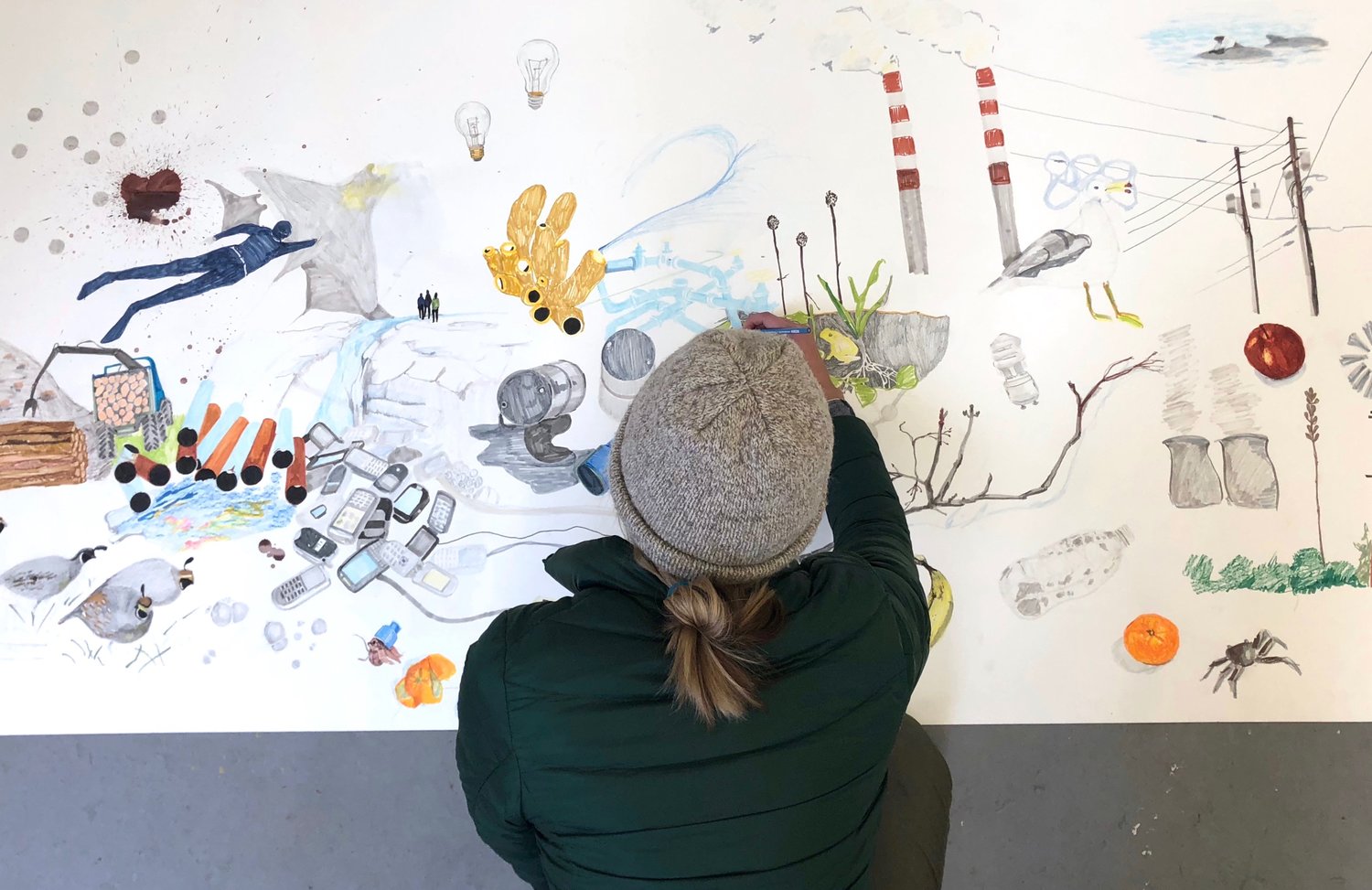 This drawing grows image after image. The more I add to it, the more imagery I want to include. Rather than aiming to resolve it, this project is increasingly more open-ended — I want to add onto it for years! It will be more impactful with deeper complexity. By making it a longer drawing over time, it implies that human impact is divergent, scattering, and always evolving.