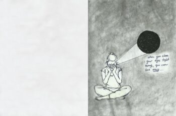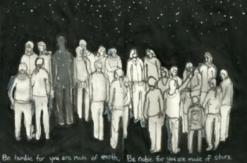Our Humanity captures our individual relationship to the cosmos as seen from the very matter that makes up our bodies. It begins with a figure sitting eyes closed, squinting to see stars from her mind’s making into a process of varied perspectives moving inside and outside of the body to reencounter the self as not being separate, but deeply connected to space.