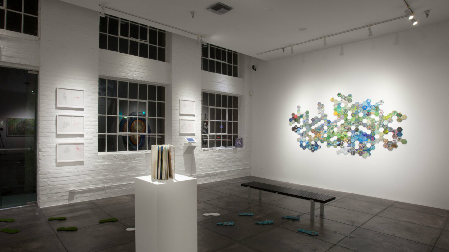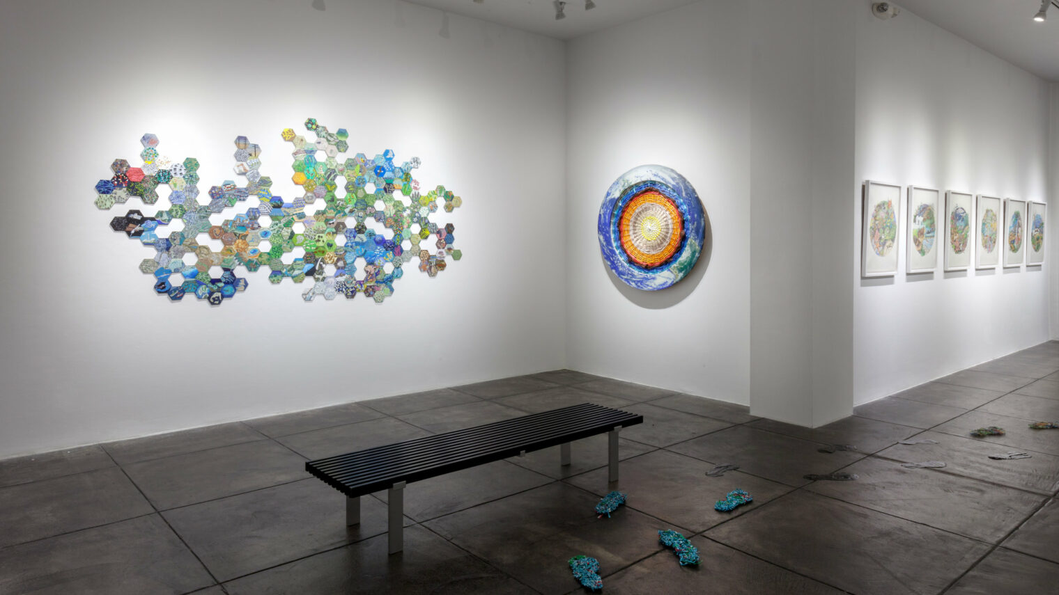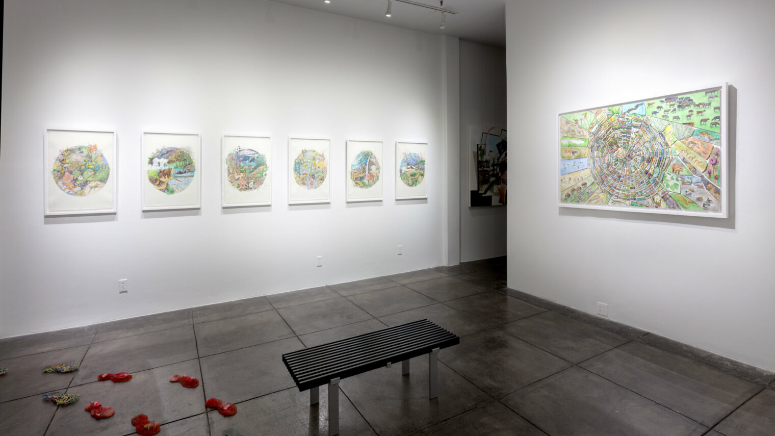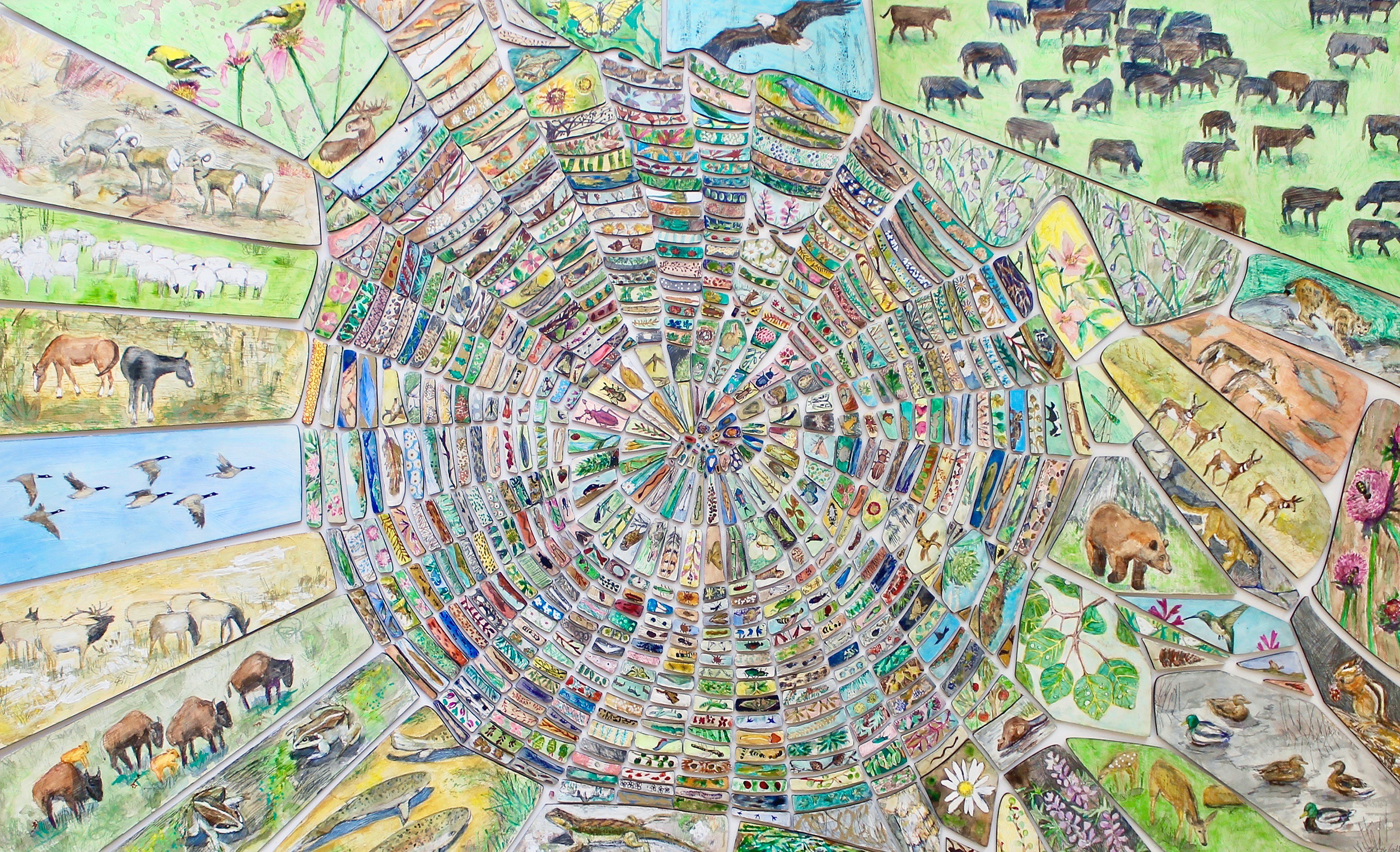 Humans are not separate from nature, but integrated and bound by it. Nature without humanity is examined in works Biosphere, Invisible Complexity, and Biodiversity, which marvel at the natural world living harmoniously as one connected and exquisite system. The natural world is innocent, void of human impact, and vibrant in color. These works depict how organisms and environments are alive and entangled. The field of Ecology is also explored in these works that link hundreds of species in unified webs and biospheres. Optimistic in scope, these works take the form of connective structures and circular compositions to suggest interconnectivity and natural unity.