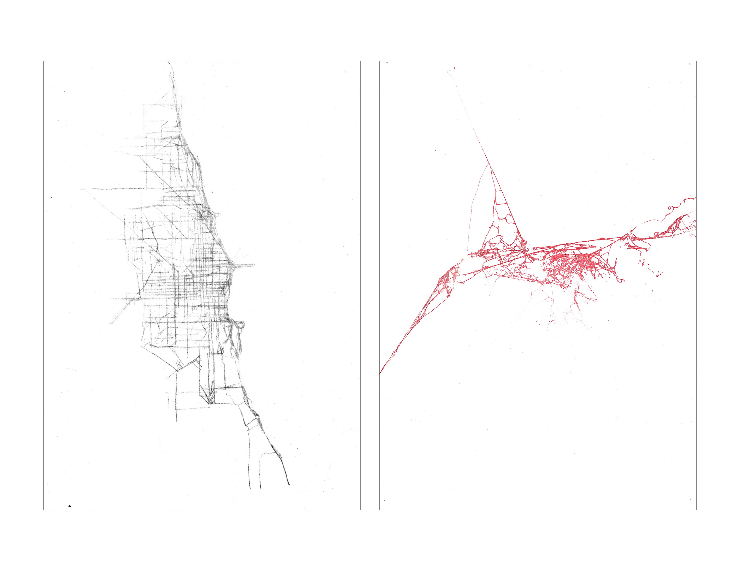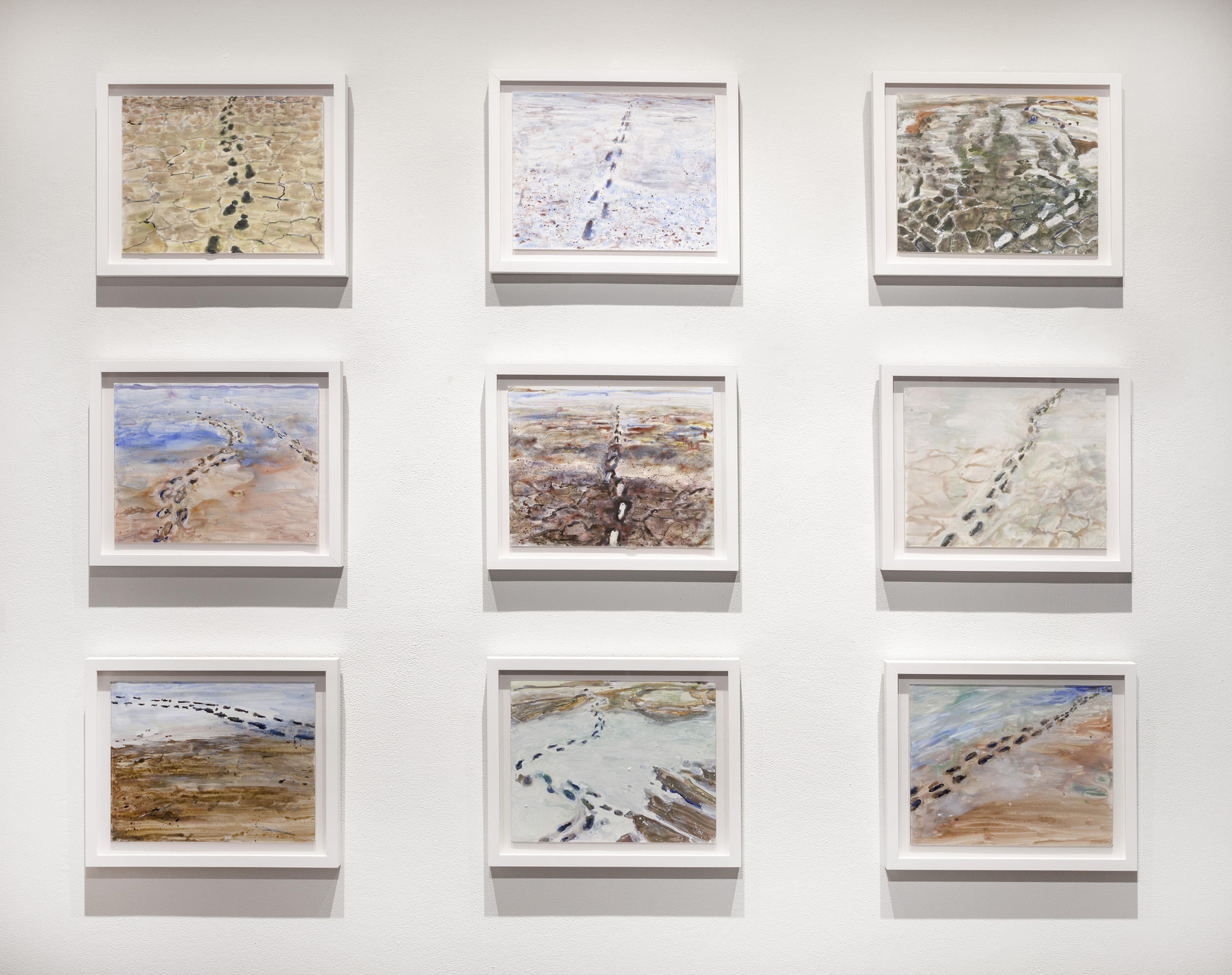 The next work, titled Imprints, illustrates our human tendency to claim territory and leave a trace marking our existence. Thereafter, the work, Eco-Footprints, represents the path we leave behind even after we cease to exist. These works fully contemplate human impact on nature, for which theorists have coined the term Anthropocene, as the geological age in which we currently exist. Traces of humanity find evidence in all facets of life. Icebergs contains oil extracted by man, while the deepest parts of the ocean is littered with our trash. Our reach has no bounds: our imprints are left everywhere, replacing pristine nature that existed before us with our own devices.