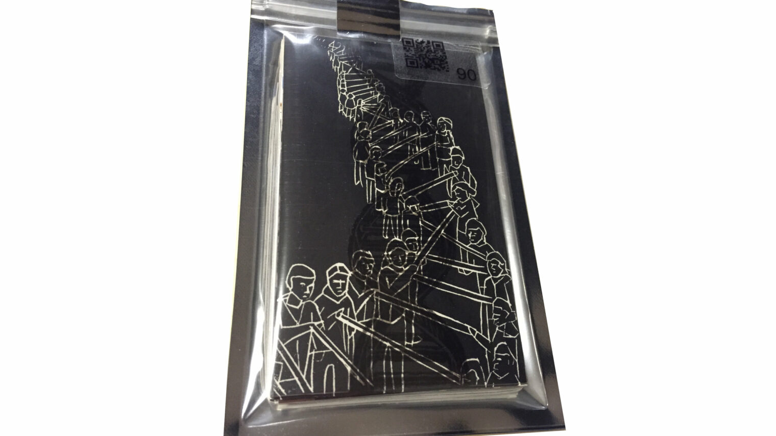 Our Humanity is a commissioned project containing two overlapping linocut prints reflecting human potential. A DNA strand symbolizes the origin of all life ghosting through a crowd of people constructing a DNA strand together, forming a ladder to the stars. This symbolizes how our humanity and collaborative capabilities take us to new heights. This print flew enclosed in a transparent pouch to outer space and back, returned with a certificate of flight detailing the object’s time in microgravity at 156.2 seconds. This project proves that the sky is not the limit.