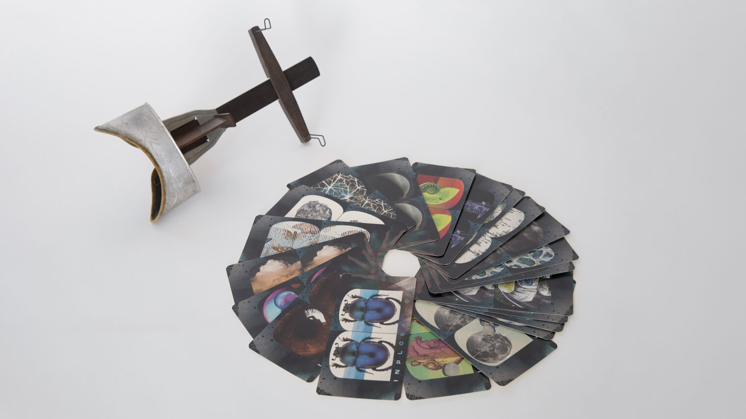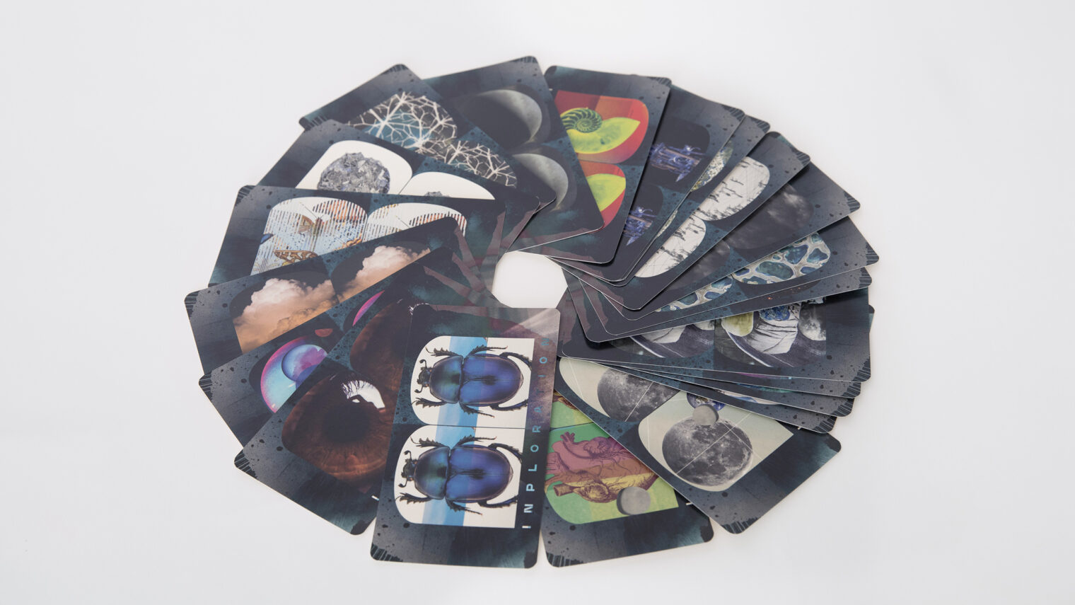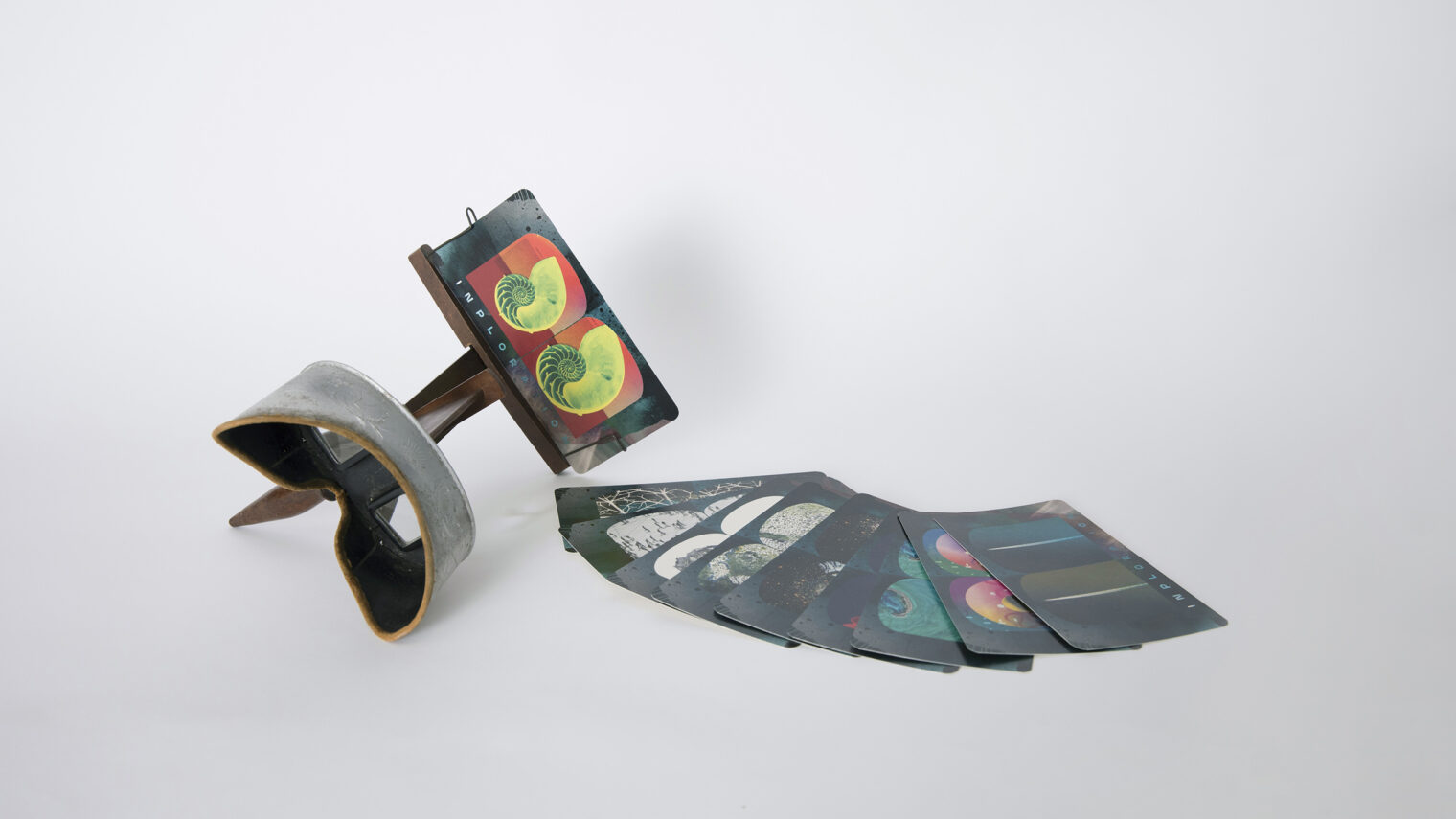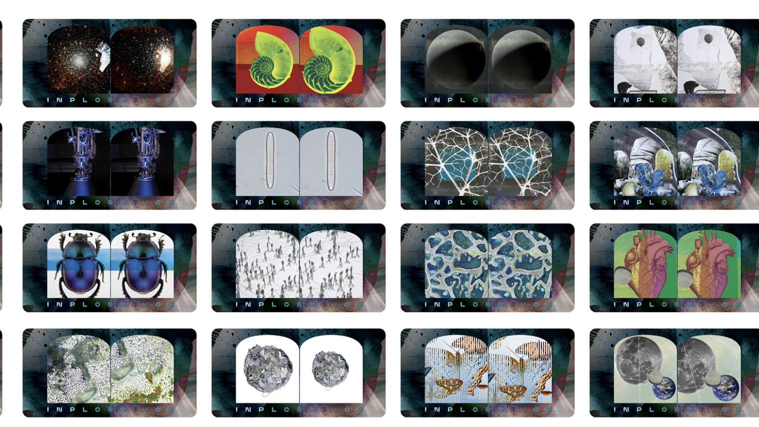 Inploration: Looking Within is comprised of twenty-four original stereoscope cards co-created with designer Lawrence Azerrad. These stereographs consist of two nearly identical photographs paired to produce the illusion of a single three-dimensional image when viewed through a stereoscope. The contents on the stereoscope visual cards include images of hand-painted and digitally crafted collages featuring subject matter that reflects the micro to macro scales, ranging from scenes both on and off Earth.