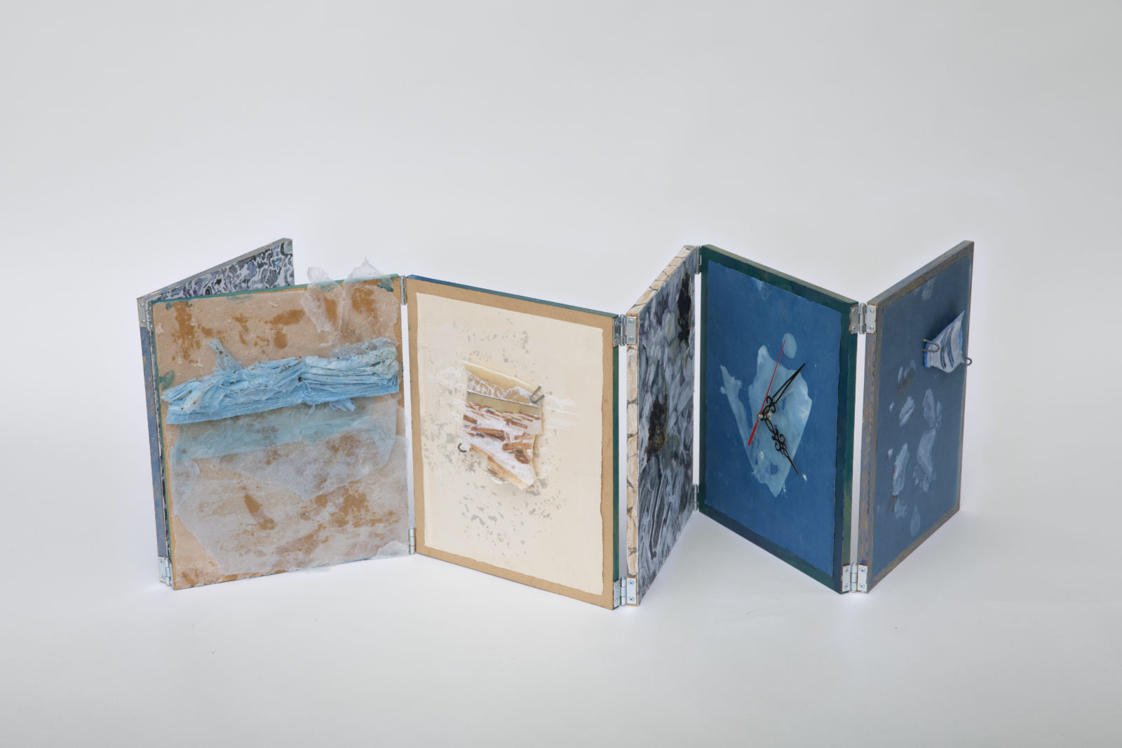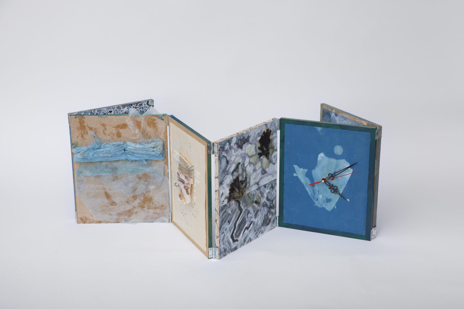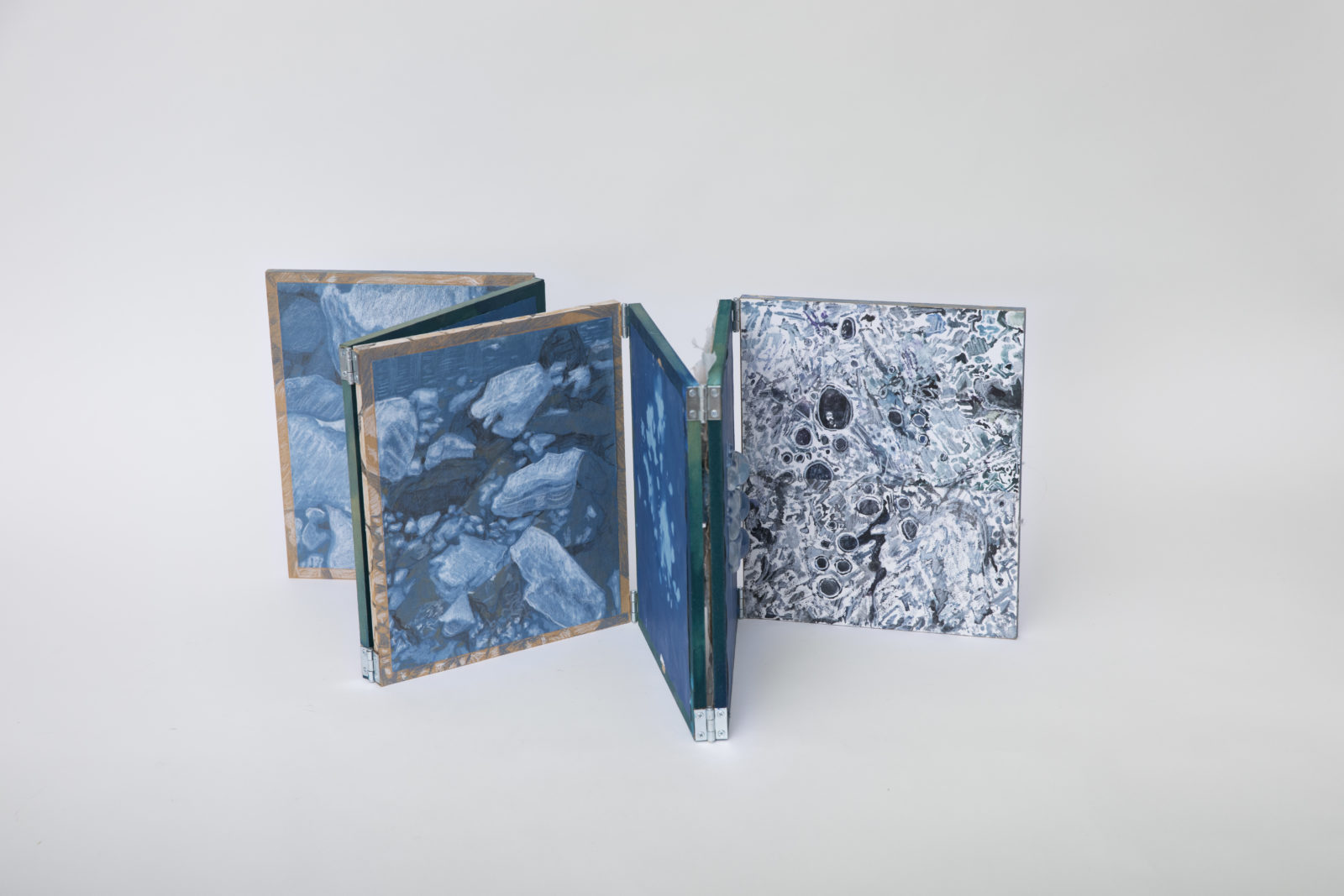 Cyanotypes and glass-like bubble capture pieces of melting ice set behind a clock to reference the disappearing ice documented near the North Pole. Illustration of landscapes along with fragments of plastic collected along shorelines capture scenes from the arctic as well as debris from human presence. Humanity is made evidence in some of the most far-reaching places on Earth, whether we know it or not, our actions are changing and reshaping ecosystems.