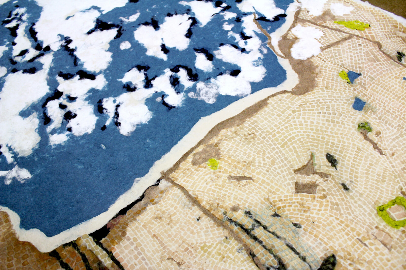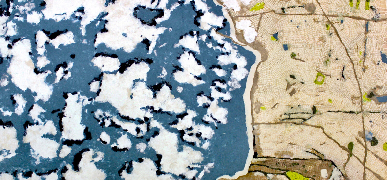 Coastline captures scattering cloud patterns from above moving across the Southern California coastline, with dark shadows moving across the water. The white sandy beaches line the water’s edge as intricate watercolor painting outlines densely packed neighborhoods below.