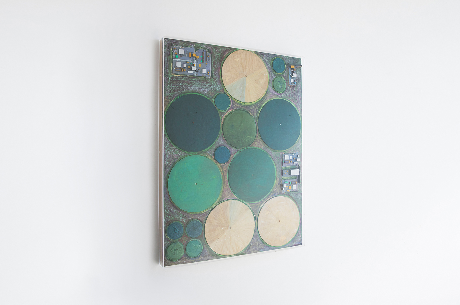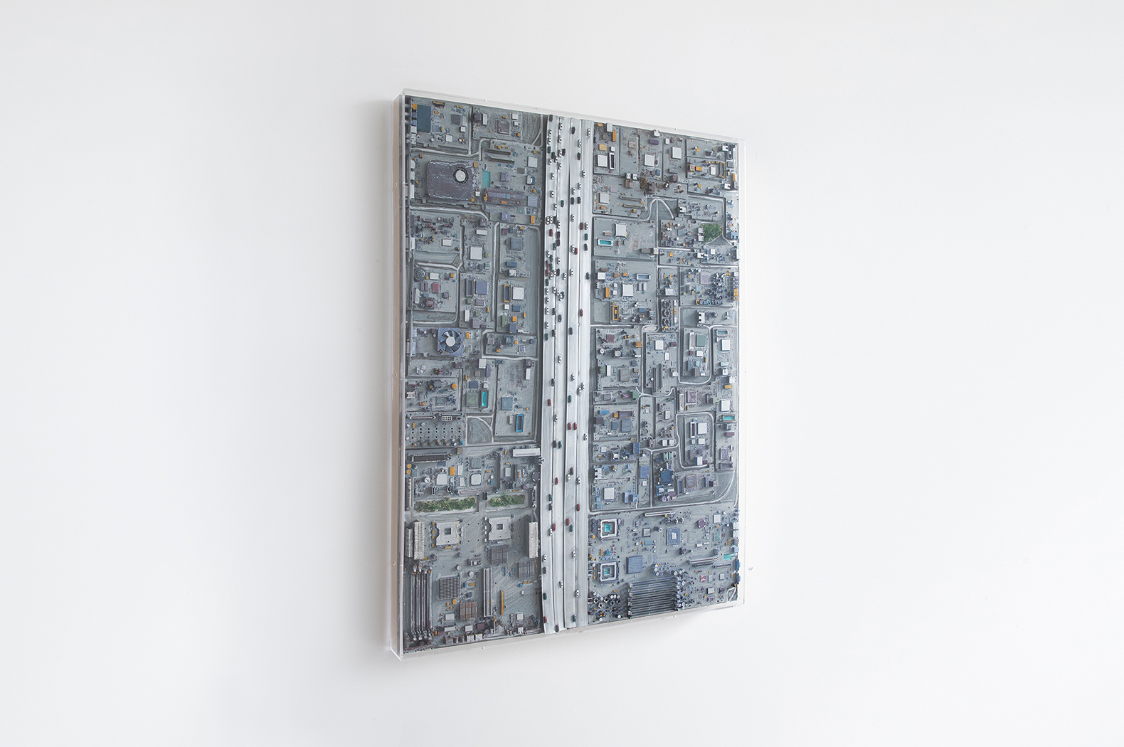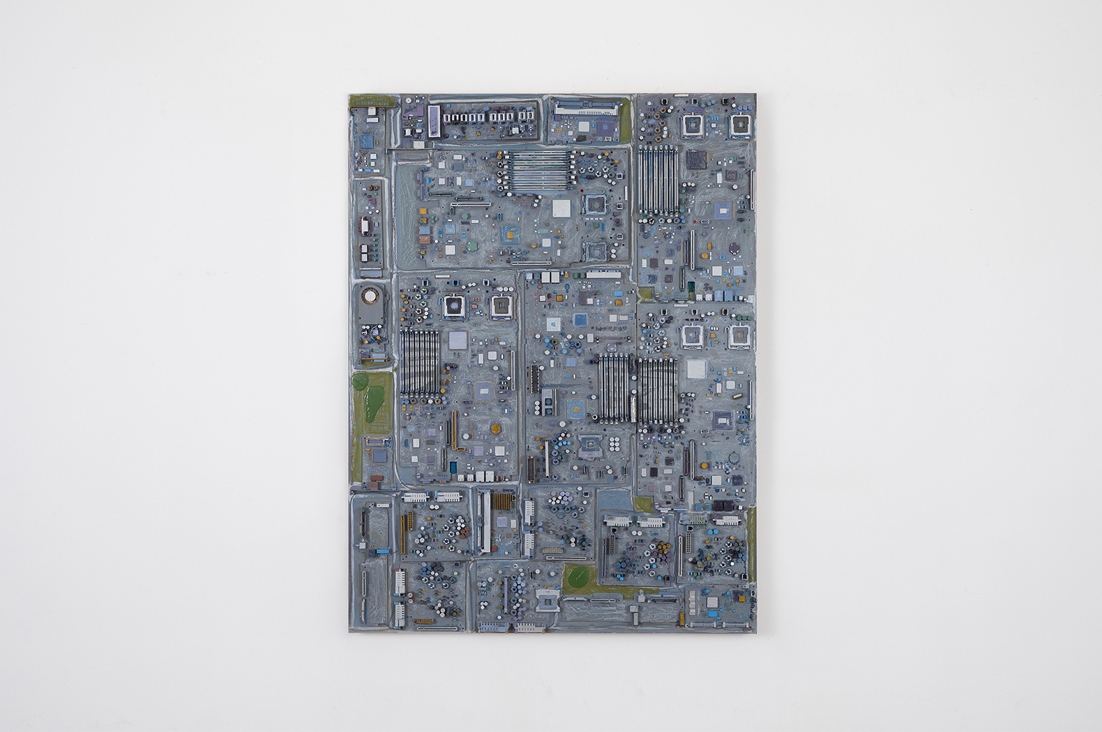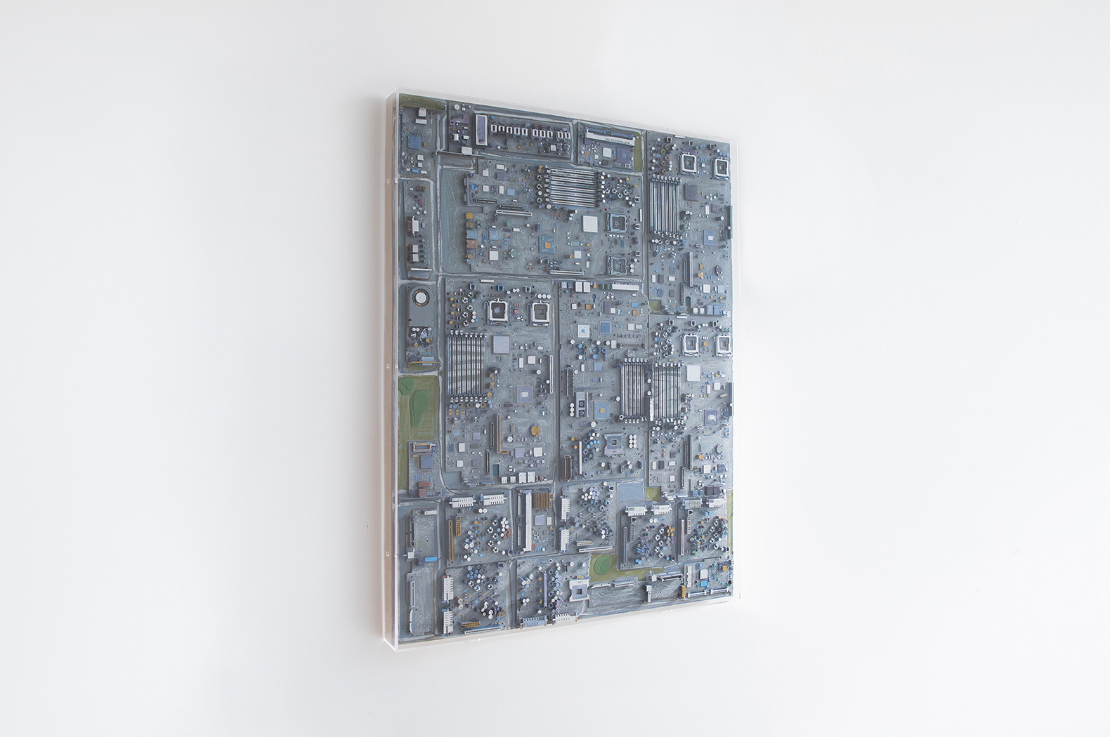 Earth Gaze is a series of mixed media paintings of urban and rural environments as seen from an aerial view perspective. Works are assembled with found objects, recycled materials, organic matter and circuit boards integrated into intricate and tactile scenes. It combines familiar landscapes with unexpected materials, shifting our gaze to see the world in new ways. The process of “earth gazing” is described by astronauts and airline passengers alike, as a meditative and deeply reflective experience, marveling at the complexities and beauty of Earth below.