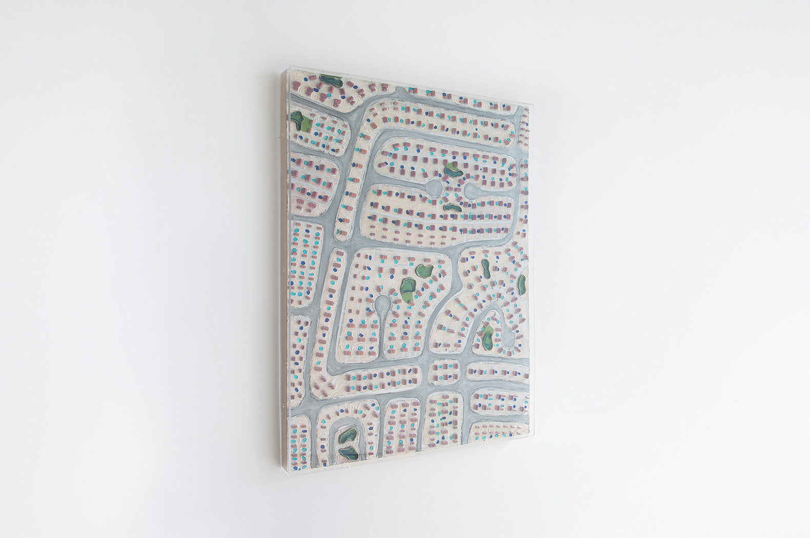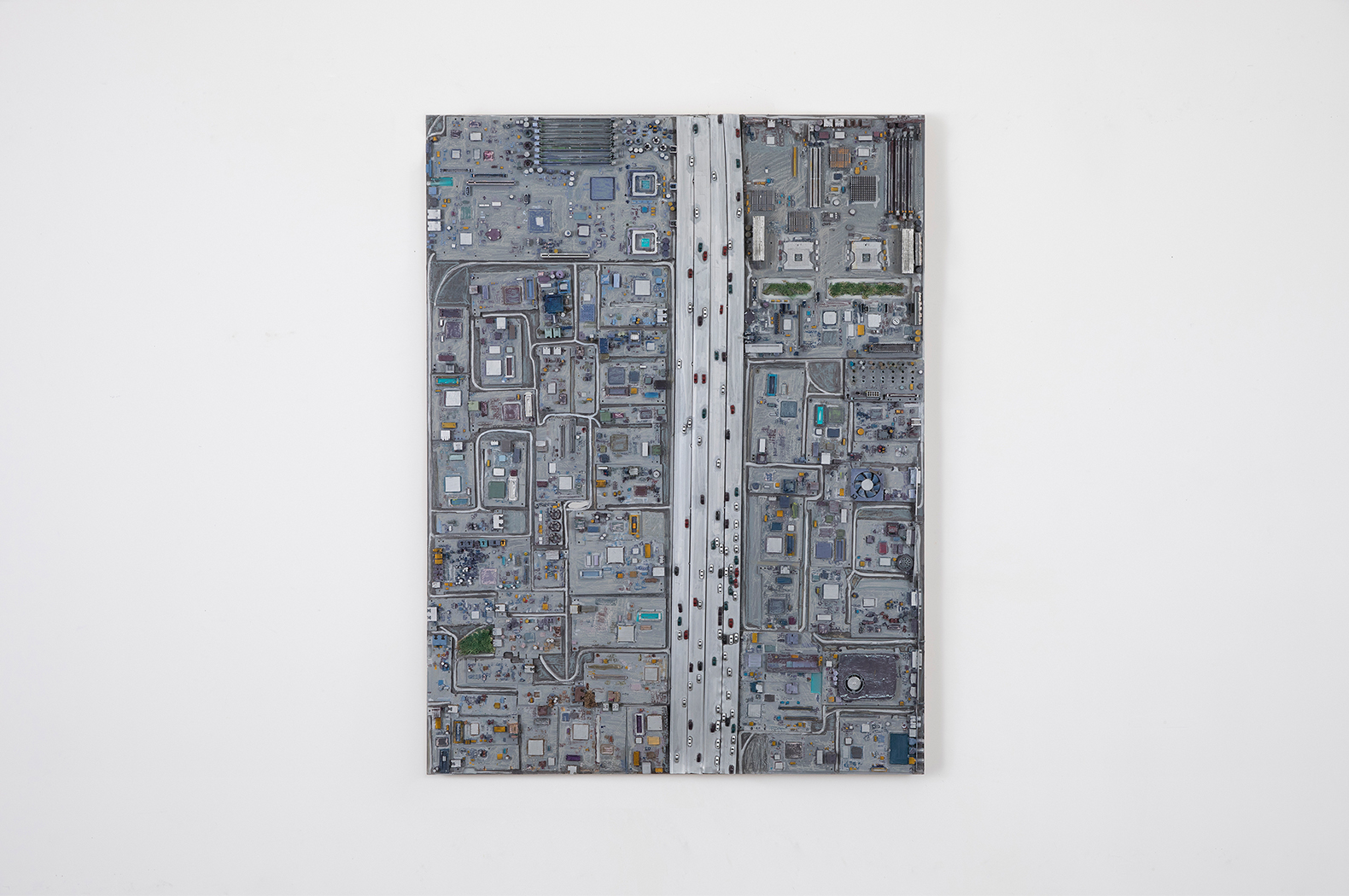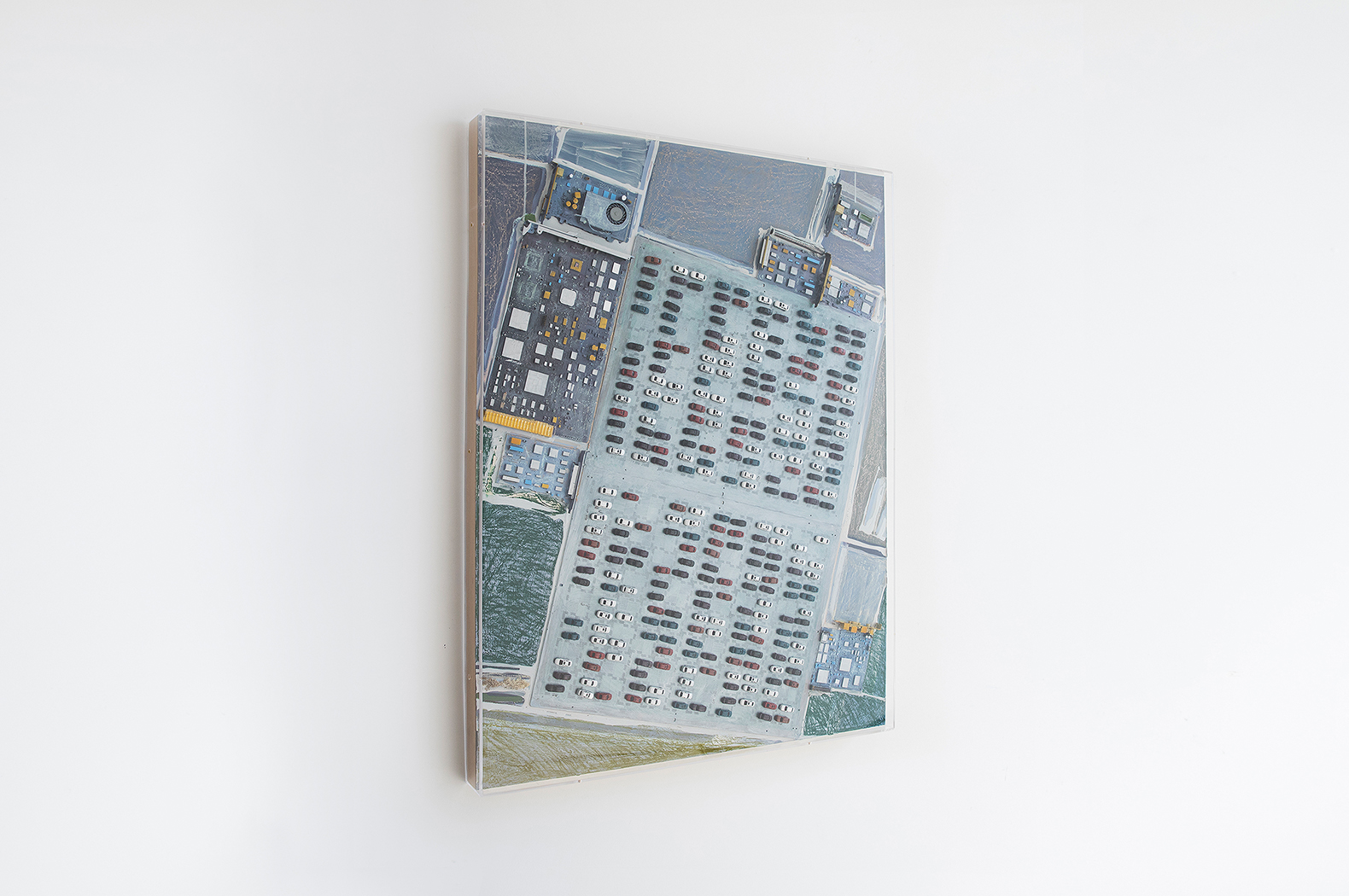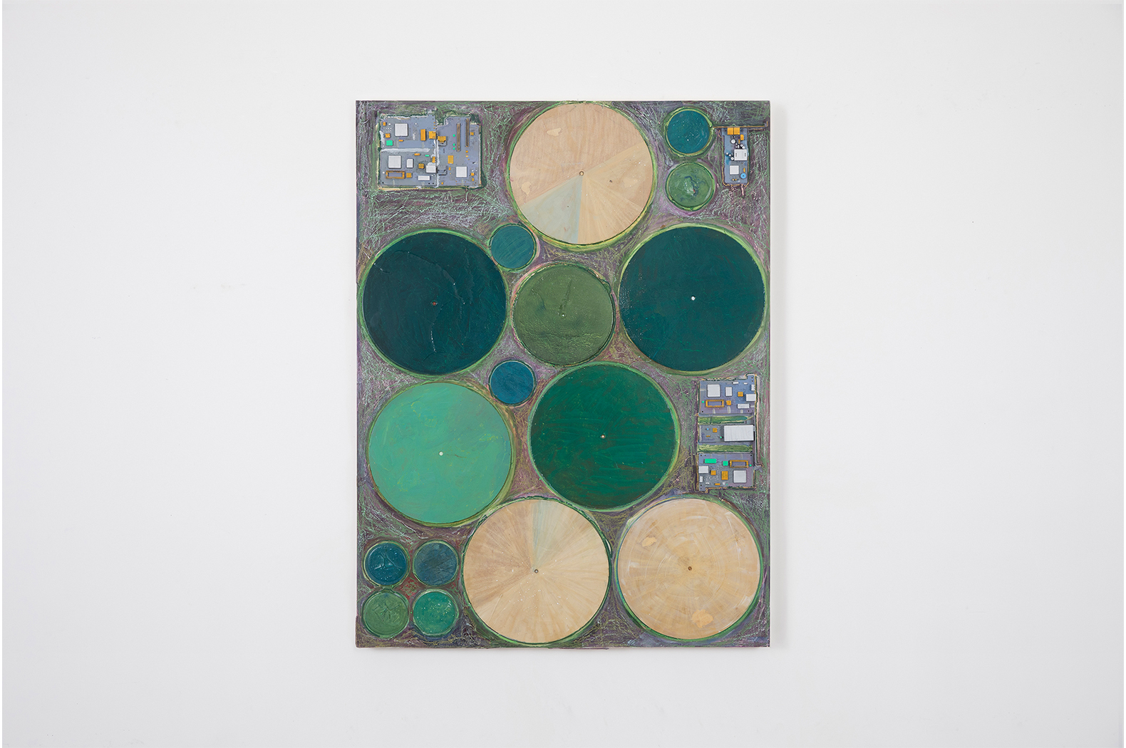 Earth Gaze is a series of mixed media paintings of urban and rural environments as seen from an aerial view perspective. Works are assembled with found objects, recycled materials, organic matter and circuit boards integrated into intricate and tactile scenes. It combines familiar landscapes with unexpected materials, shifting our gaze to see the world in new ways. The process of “earth gazing” is described by astronauts and airline passengers alike, as a meditative and deeply reflective experience, marveling at the complexities and beauty of Earth below.