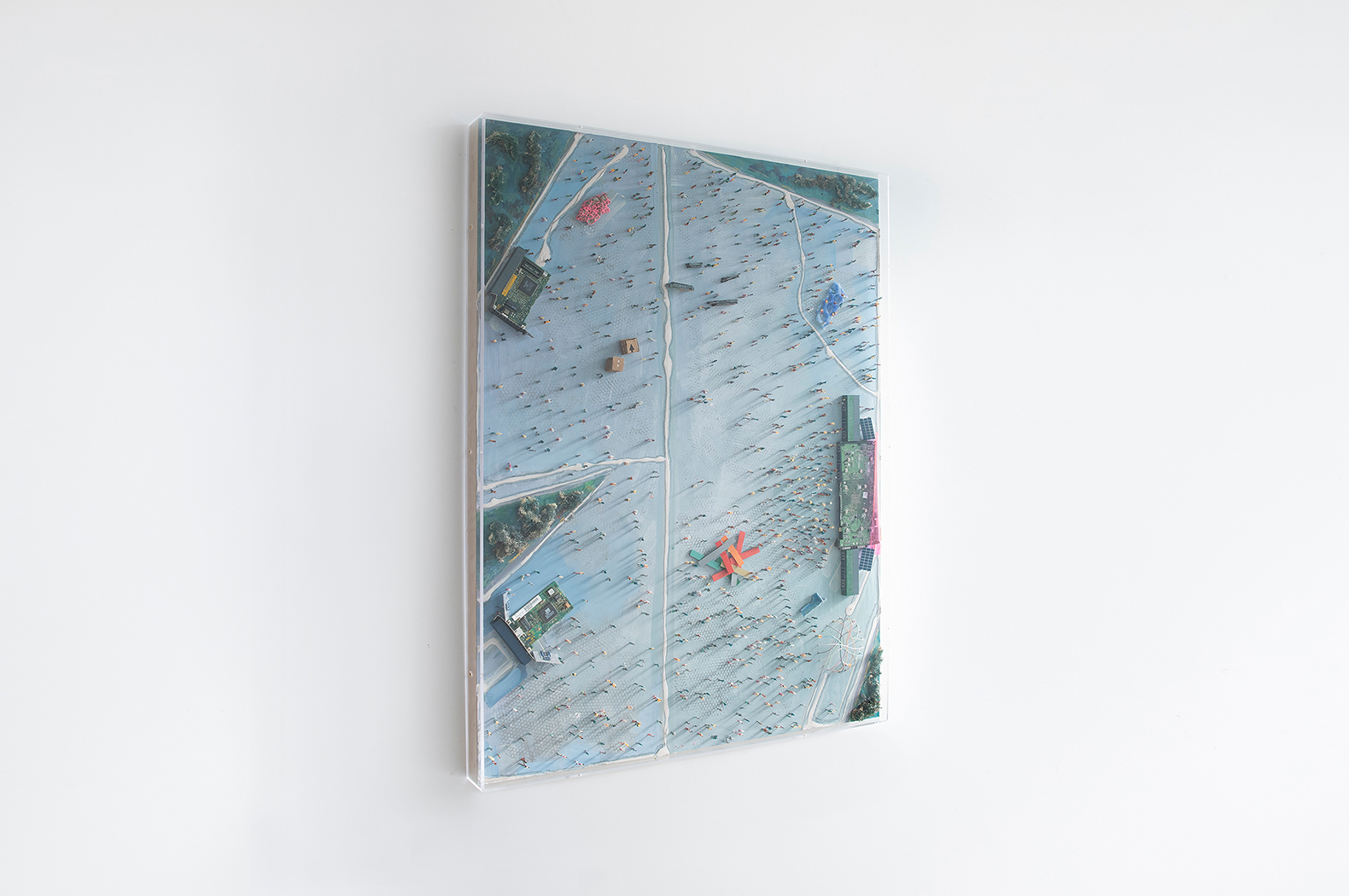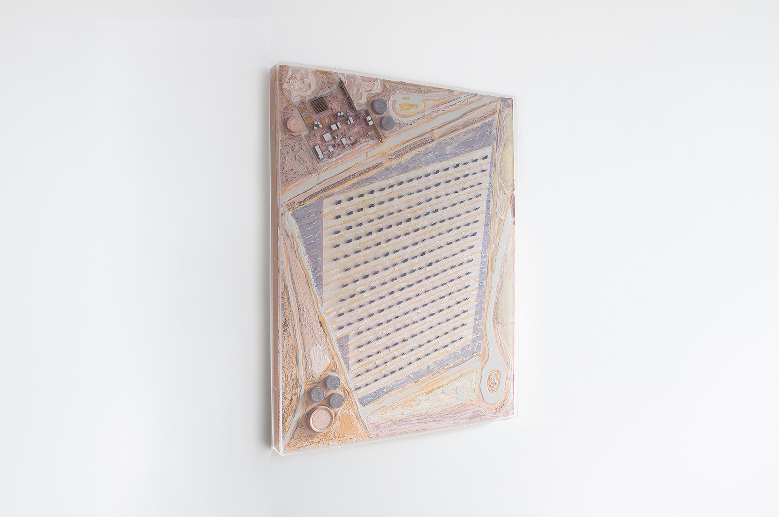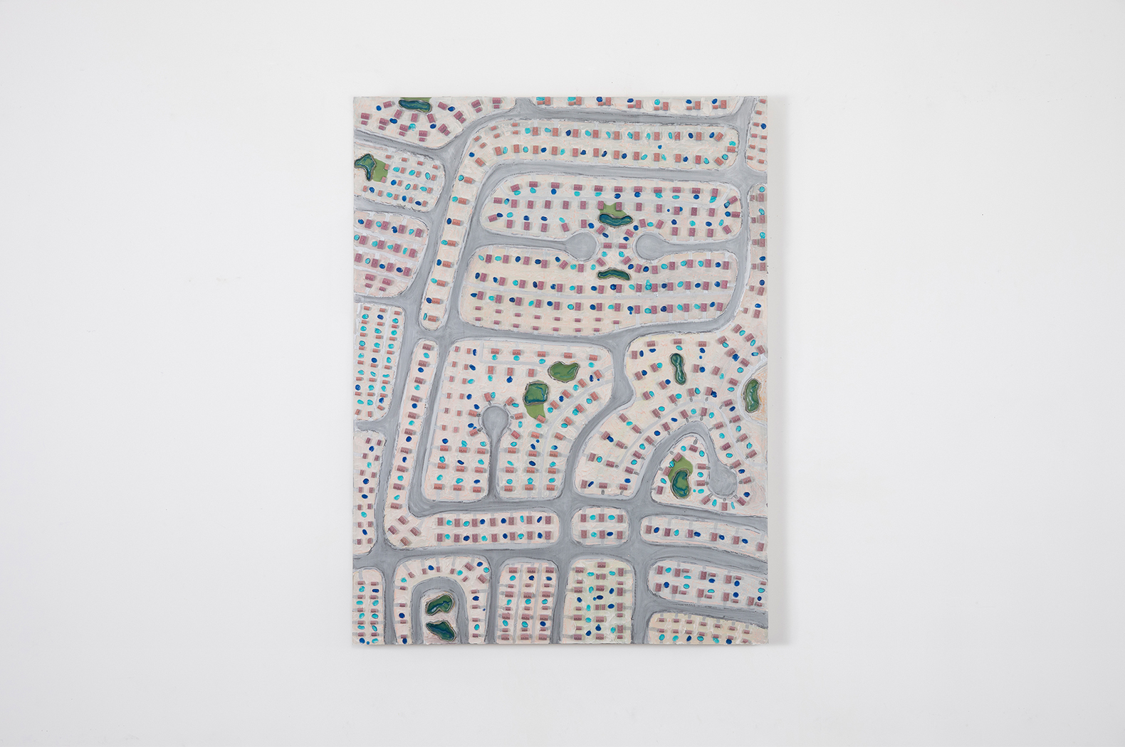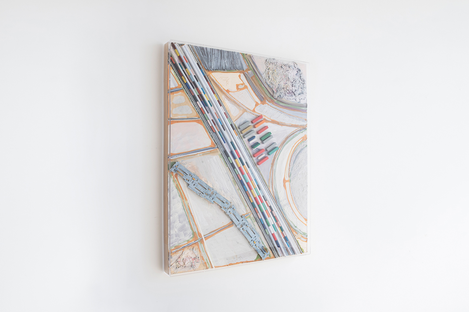 Earth Gaze is a series of mixed media paintings of urban and rural environments as seen from an aerial view perspective. Works are assembled with found objects, recycled materials, organic matter and circuit boards integrated into intricate and tactile scenes. It combines familiar landscapes with unexpected materials, shifting our gaze to see the world in new ways. The process of “earth gazing” is described by astronauts and airline passengers alike, as a meditative and deeply reflective experience, marveling at the complexities and beauty of Earth below.