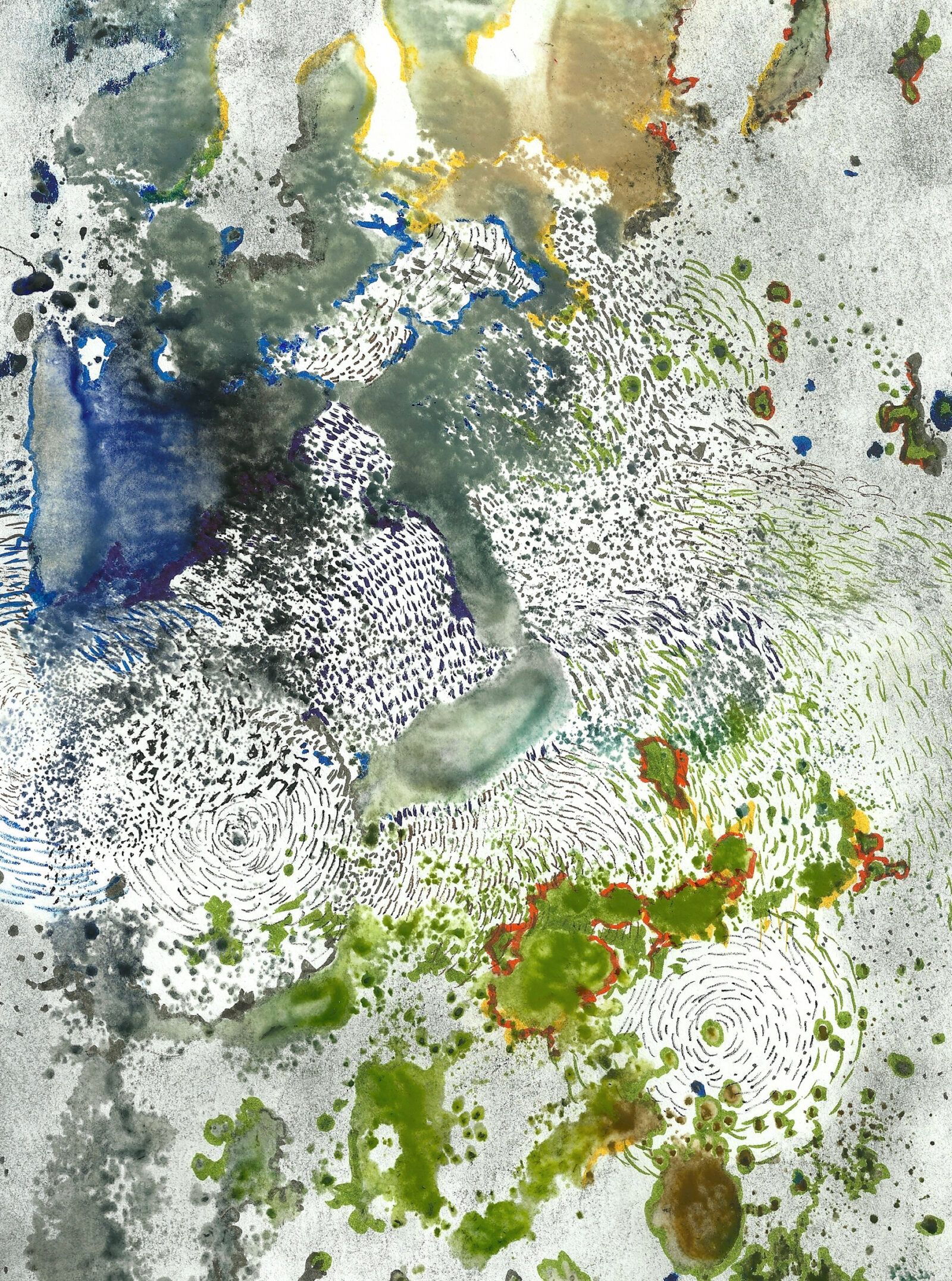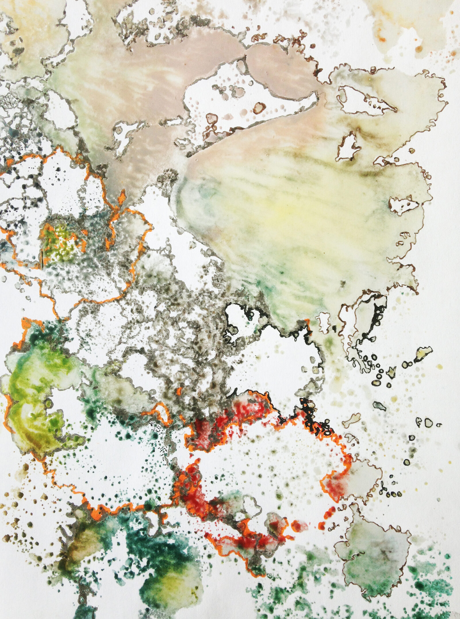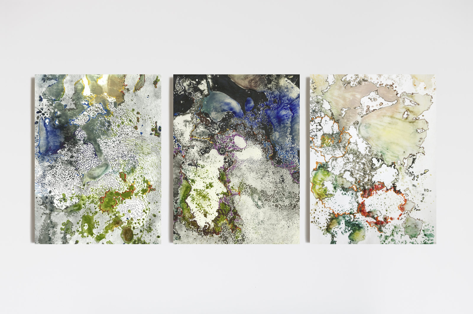 Growth is inspired by the colors, textures and forms of mold growth as it often mimics forms, shapes and textures of terrestrial landscapes as seen from an aerial perspective. Mold usually spreads in the form of patches or small circles, but it can have irregular patterns as well. It may also spread in the form of a concentric circle patterns.