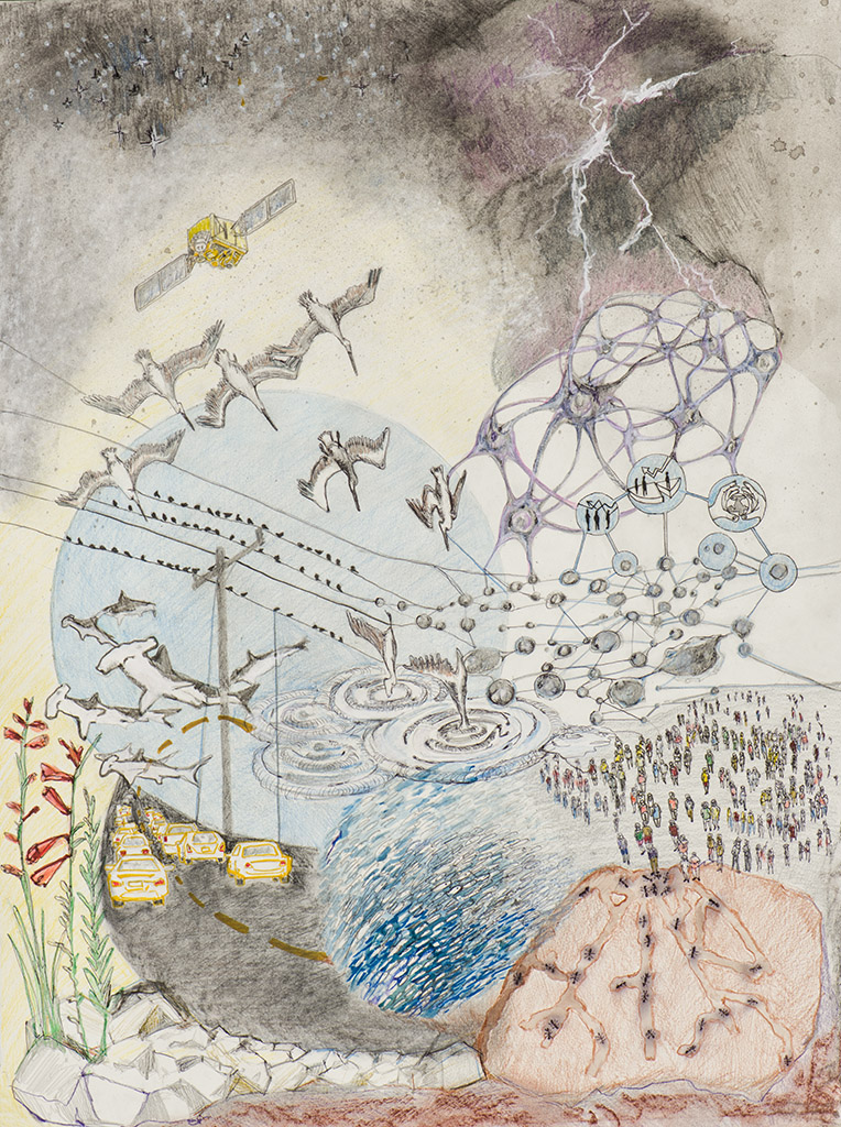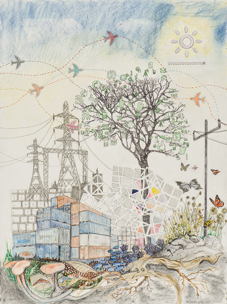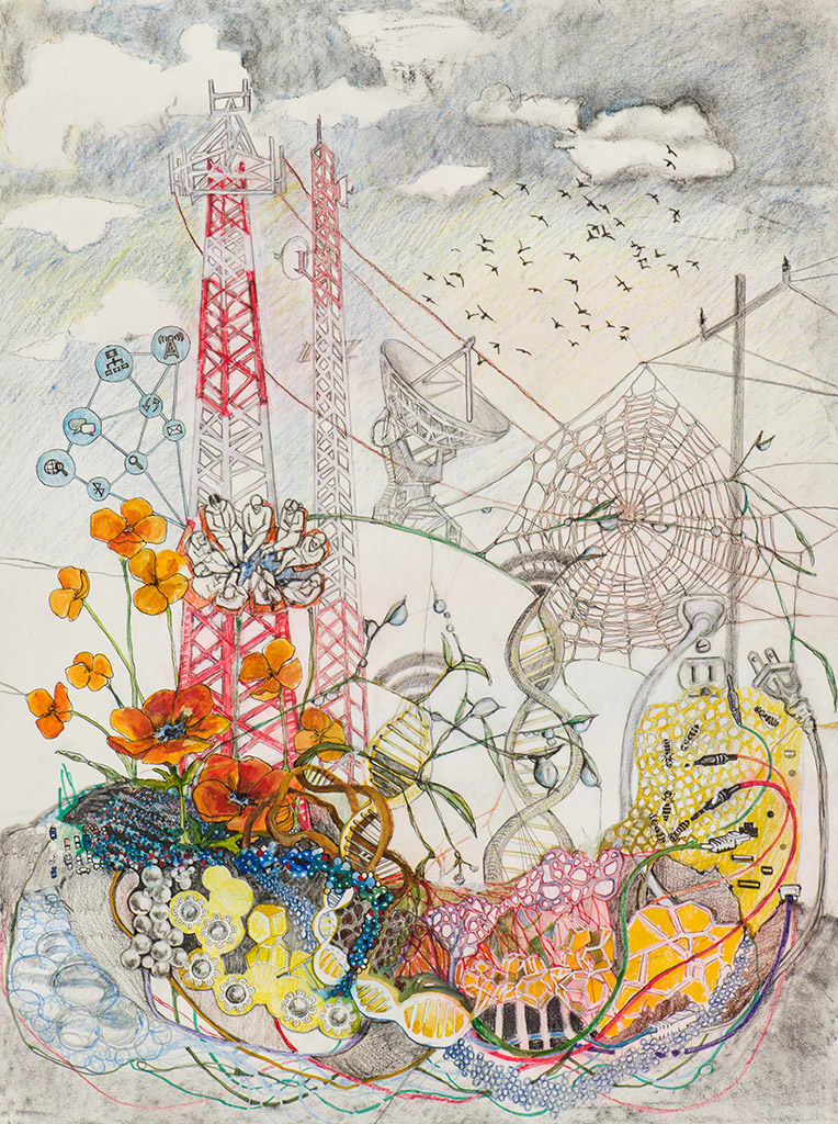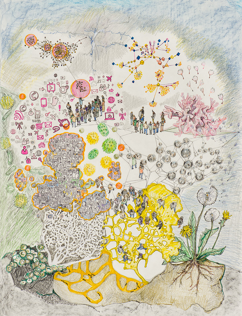 This series combines our social, environmental, technological, and biological networks to imply our interdependence in a connected world. For example, the Wifi symbol appears in the lower ladder of a DNA strand, telephone lines link to strands of a spider web, and diagrams of Facebook friends scatter into cloud patterns.