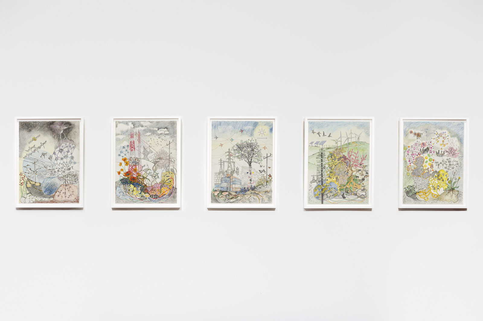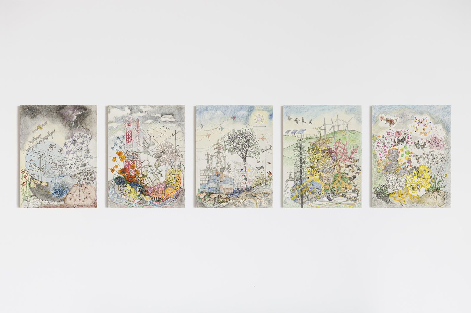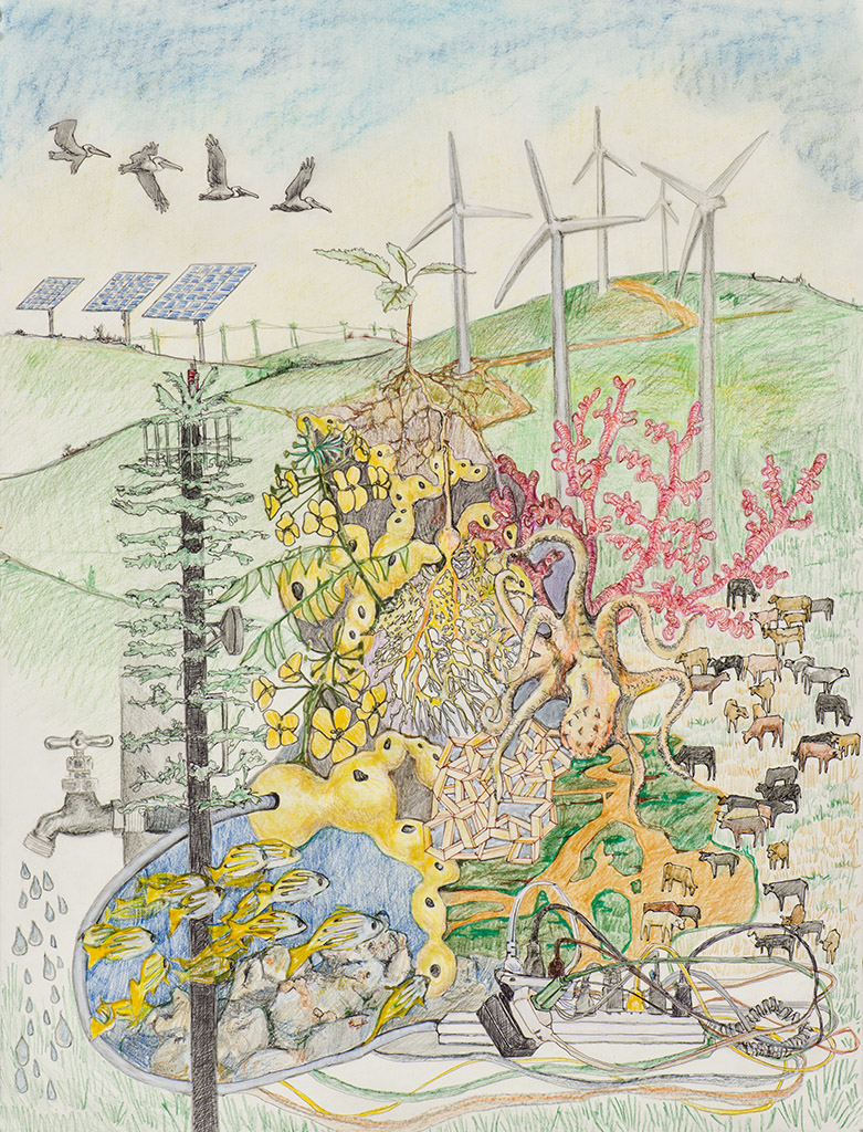 This series combines our social, environmental, technological, and biological networks to imply our interdependence in a connected world. For example, the Wifi symbol appears in the lower ladder of a DNA strand, telephone lines link to strands of a spider web, and diagrams of Facebook friends scatter into cloud patterns.