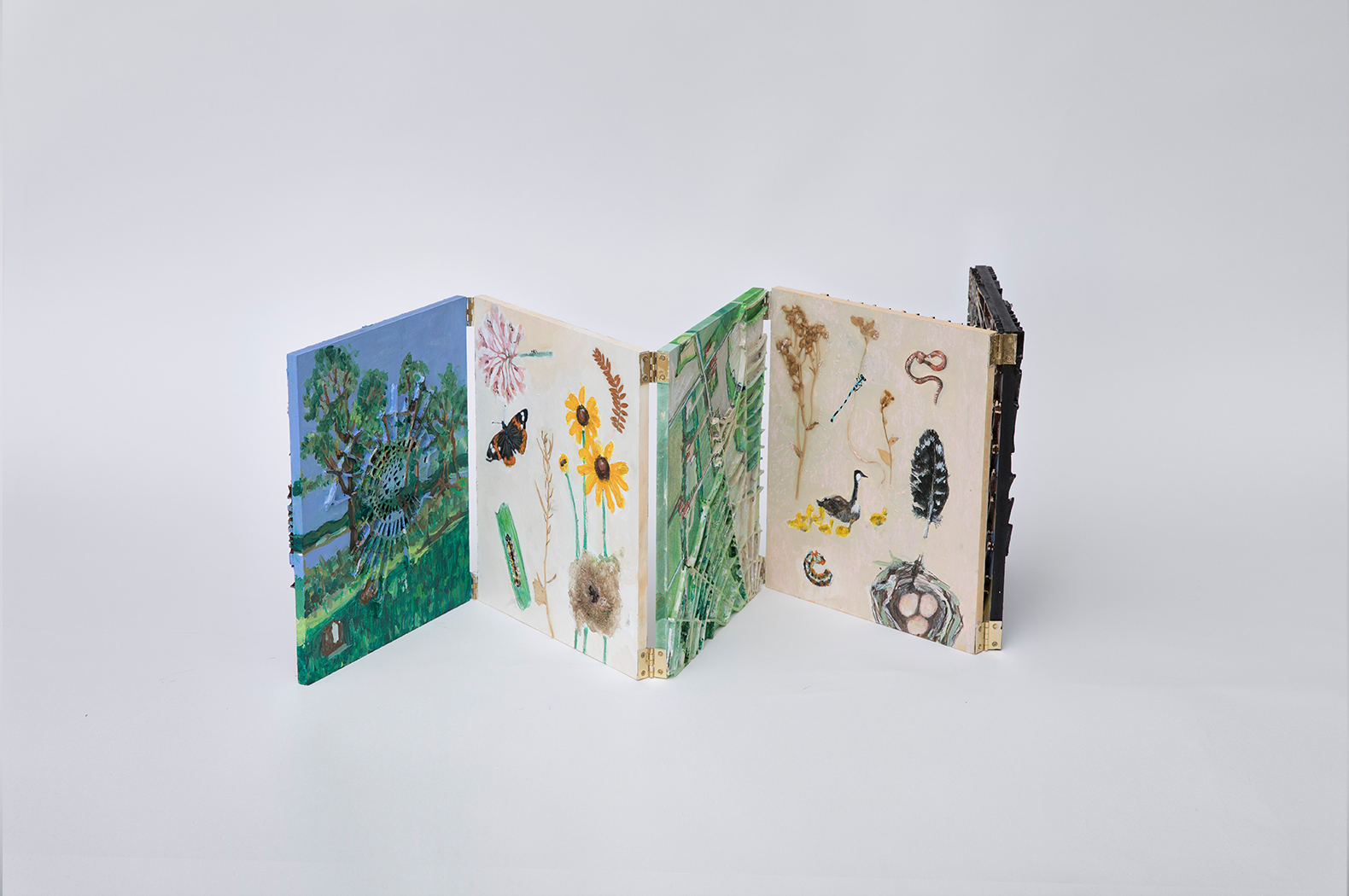 Lakeside documents insects, animals and plants seen and observed in the Midwest region of the United States. Seeds and leaves are carefully illustrated within a spider’s web recalling the interdependencies of species forming a web of life of the local habitat. This accordian-style journal contains sights and textures of the grasslands surrounding a lake, revealing the abundance of life within a thriving ecosystem.