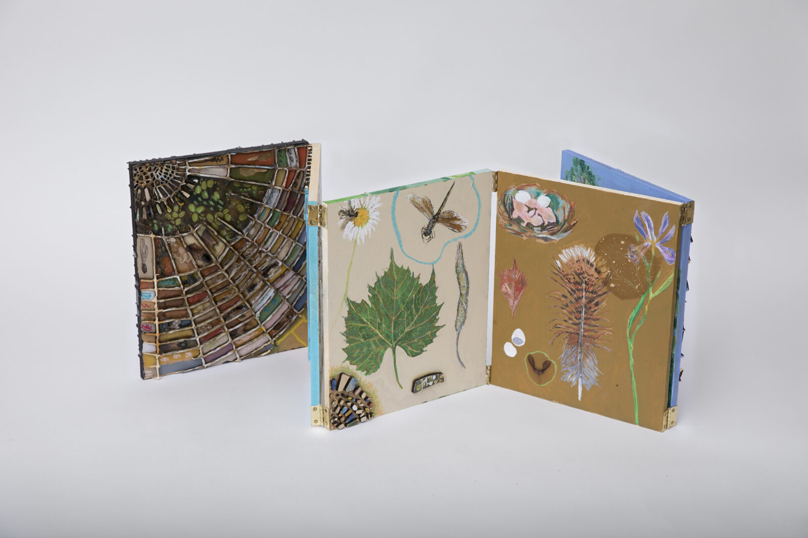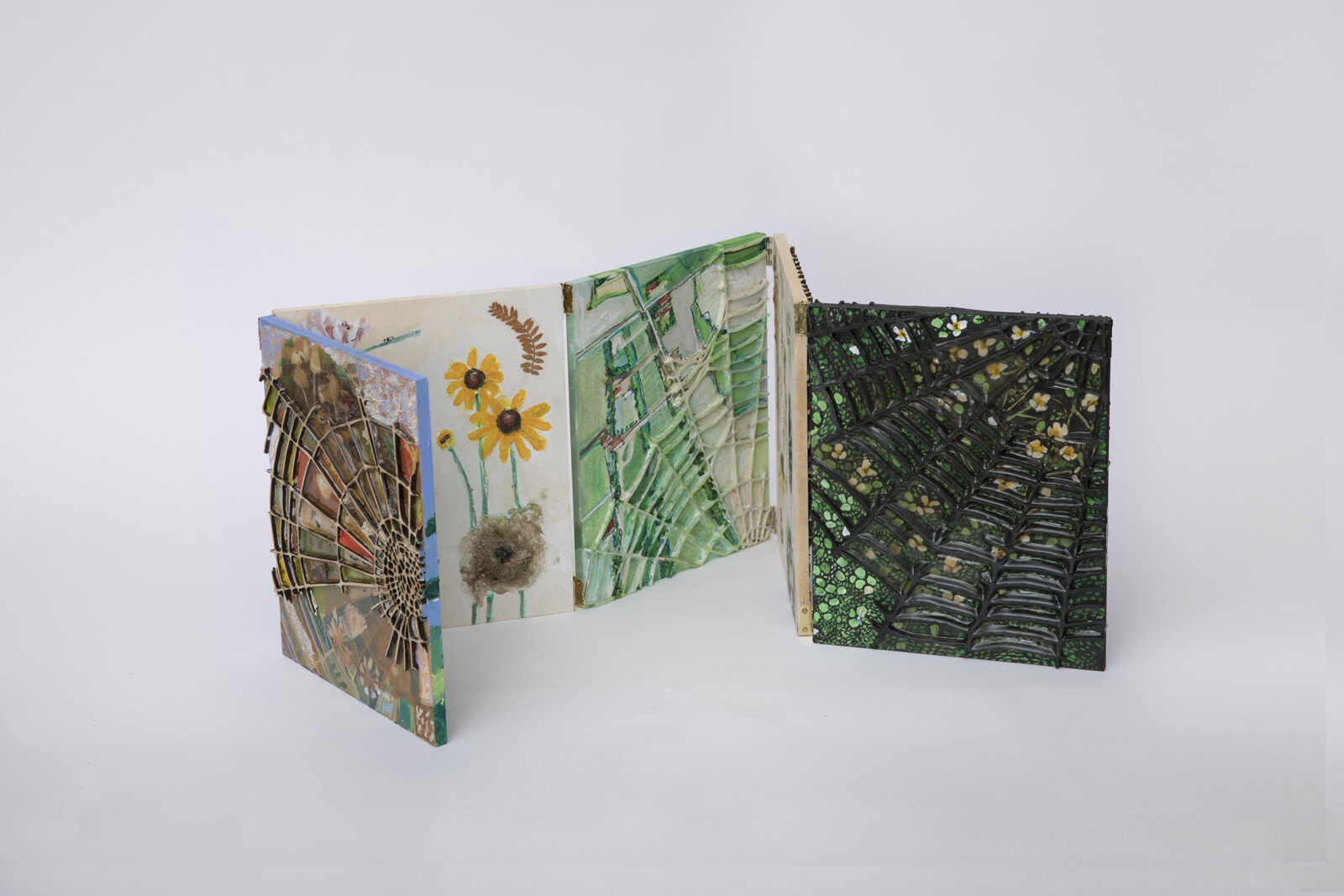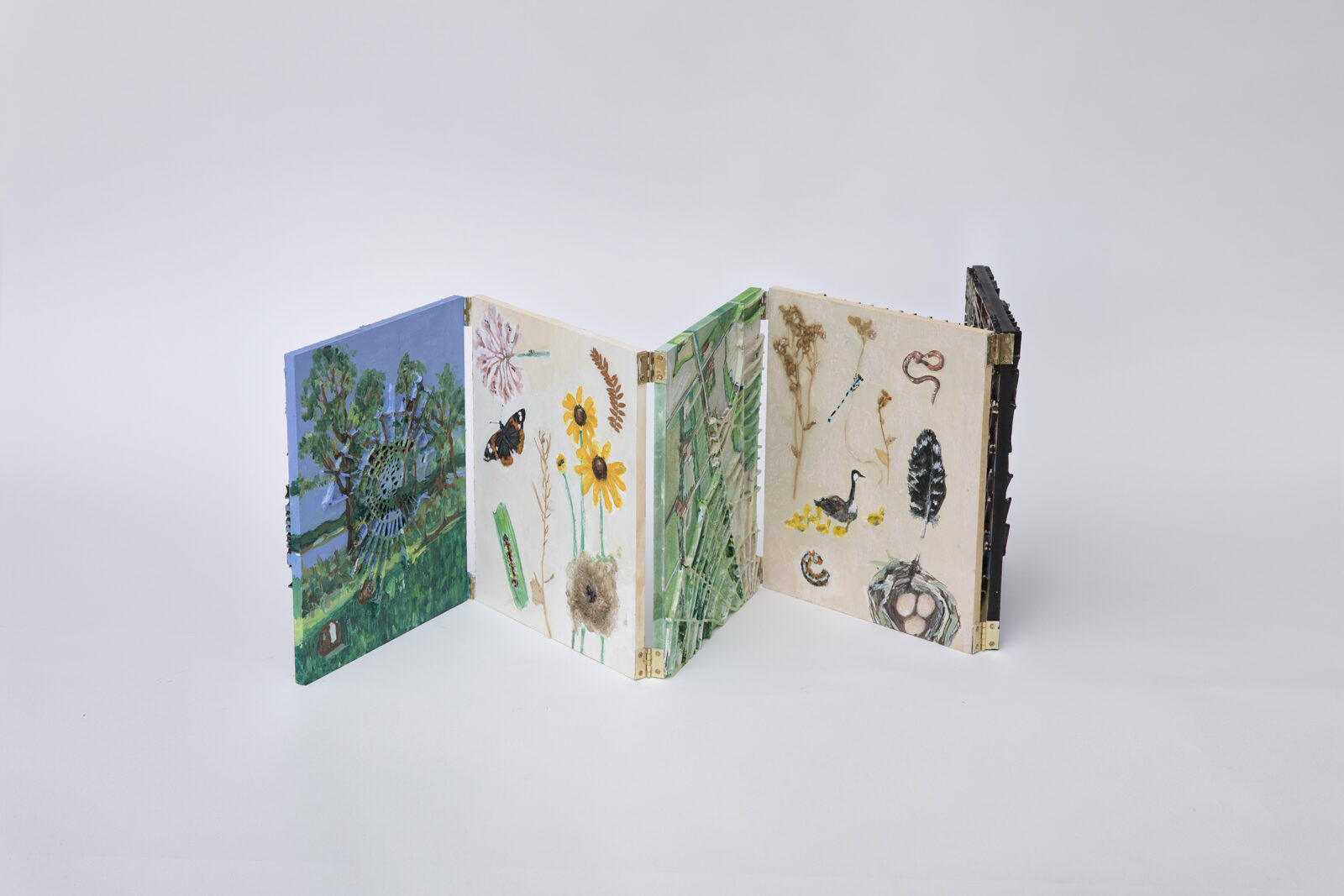 Lakeside documents insects, animals and plants seen and observed in the Midwest region of the United States. Seeds and leaves are carefully illustrated within a spider’s web recalling the interdependencies of species forming a web of life of the local habitat. This accordian-style journal contains sights and textures of the grasslands surrounding a lake, revealing the abundance of life within a thriving ecosystem.