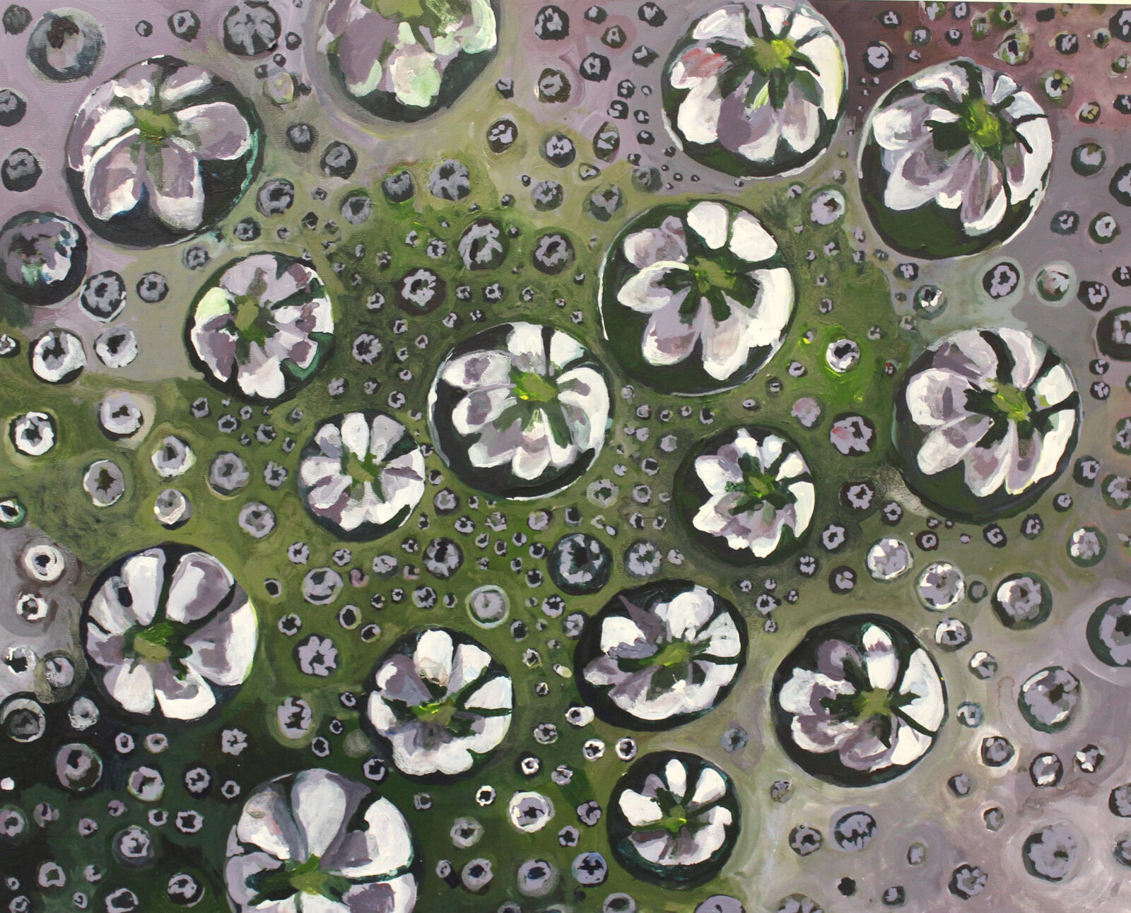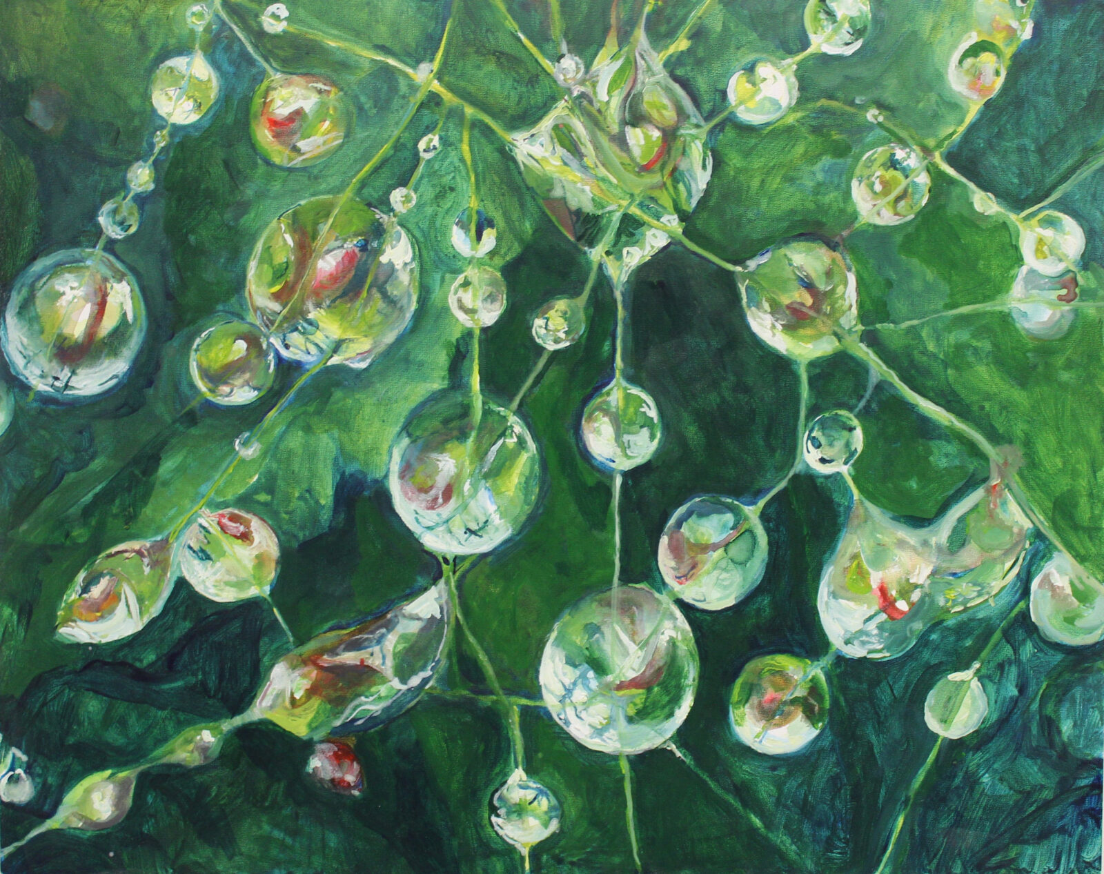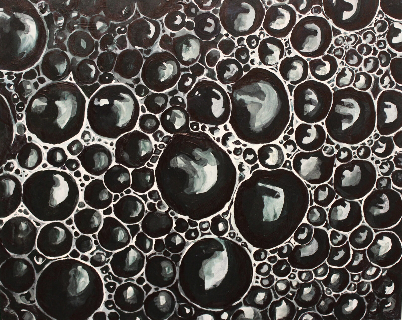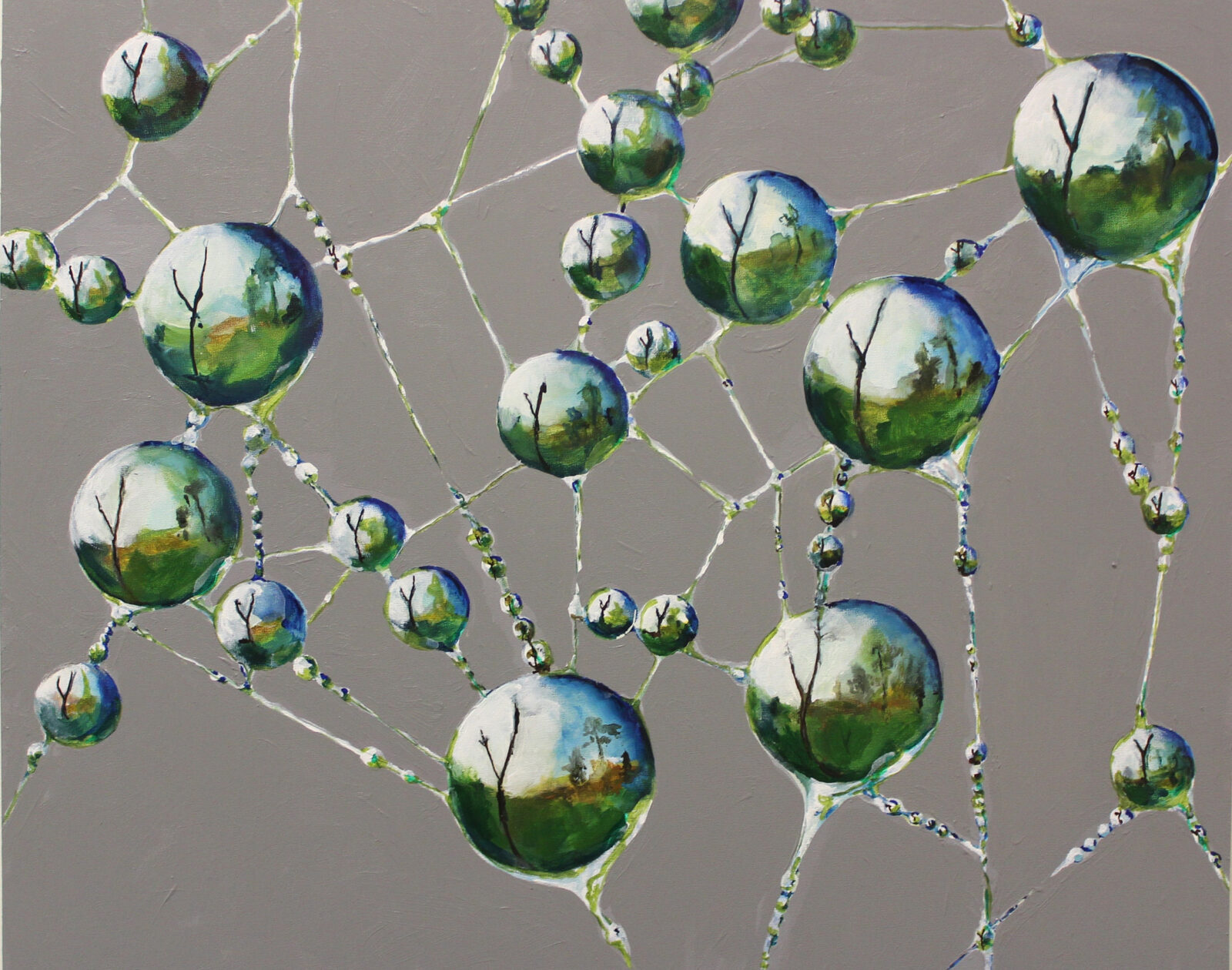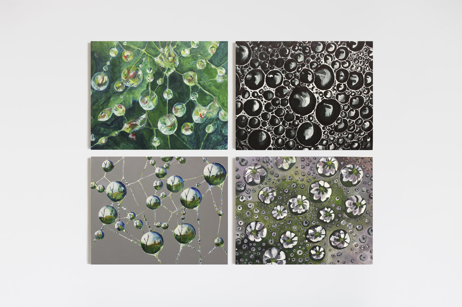 Inspired by the multiverse, networks, and Indra’s Net, each painting consists of reflective nodes that mirror the environment in repetitive ways. These paintings utilize concrete subject matter (droplets, foam, spider webs) to depict the “parallel universes” or “bubble universes.”