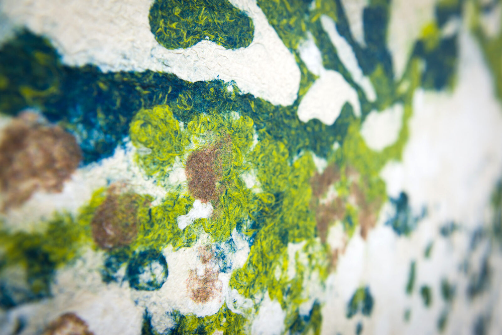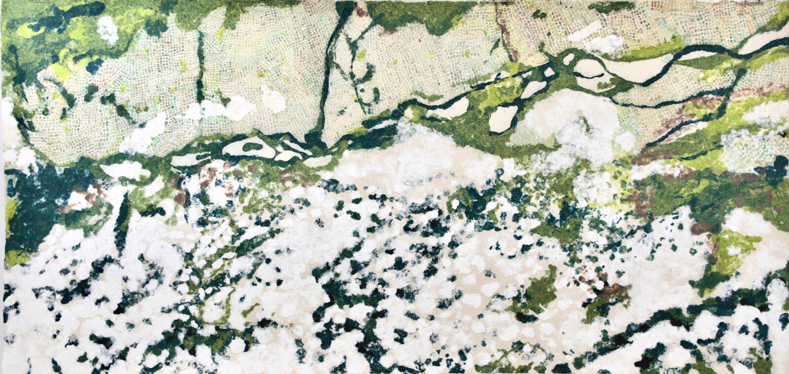 Pulp painting with hand-colored and pressed kozo pulp with watercolor. Source material found using Planet Explorer Data provided by Planet Labs, an Earth-imaging company. Yoshinogawa: Oct. 21, 2017 – 4Band Planet Scope Scene 83% area coverage (3m)