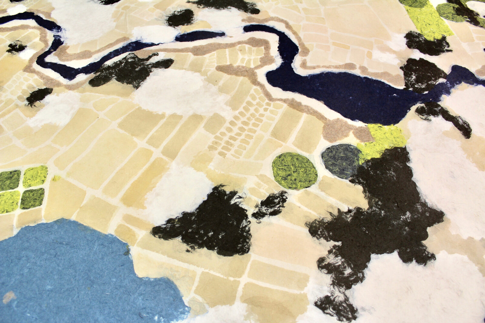 Shifting Patterns is a pulp painting documenting an area in the American south documented by Planet’s CubeSat. Cloud patterns hover above farmlands below. The shadows of each cloud creates a pattern of dark shapes across the aerial view with crop circles dividing the land into a patchwork of vibrant shapes and colors.