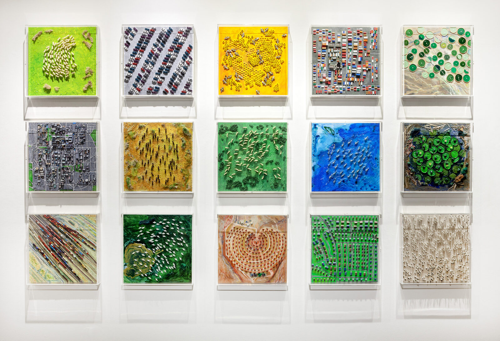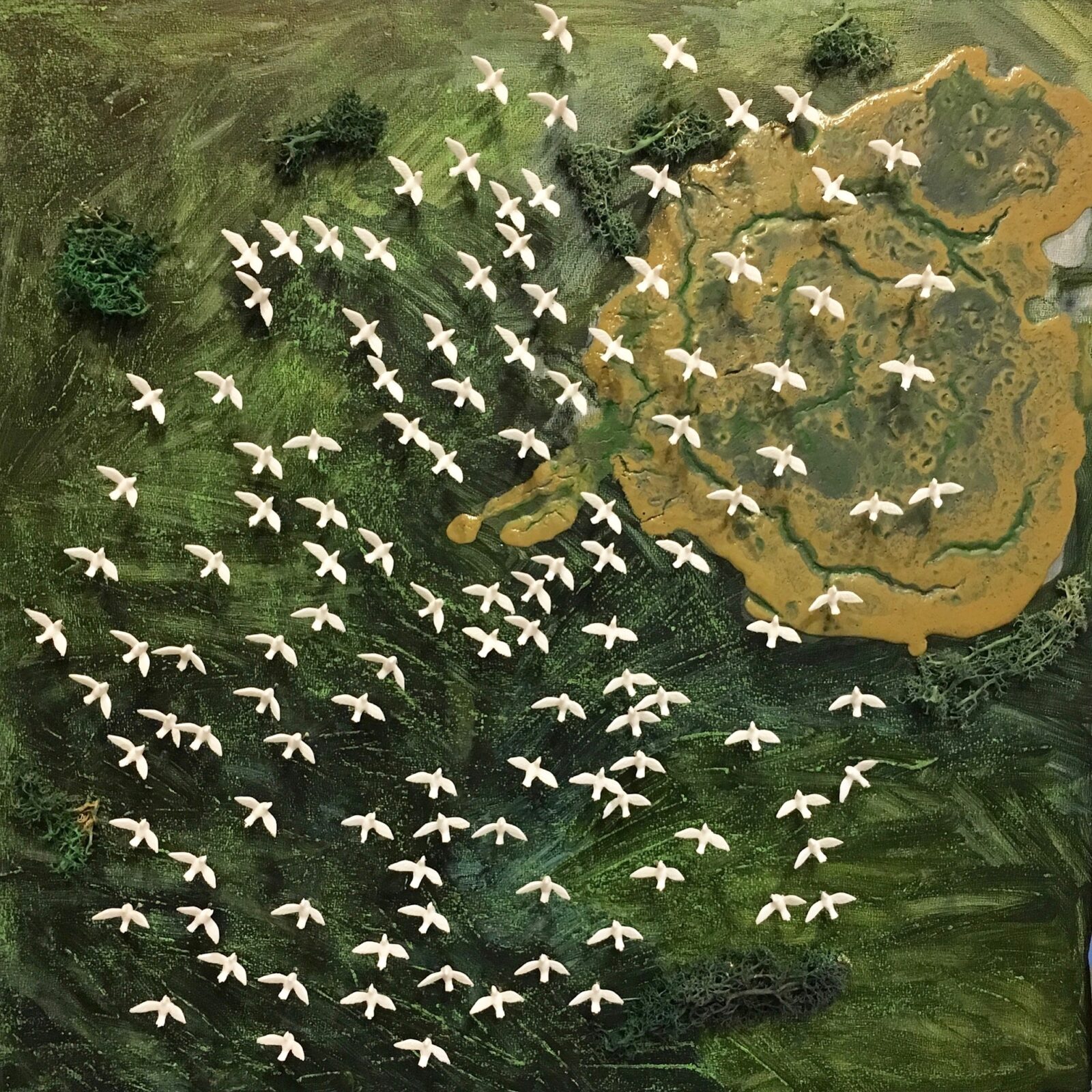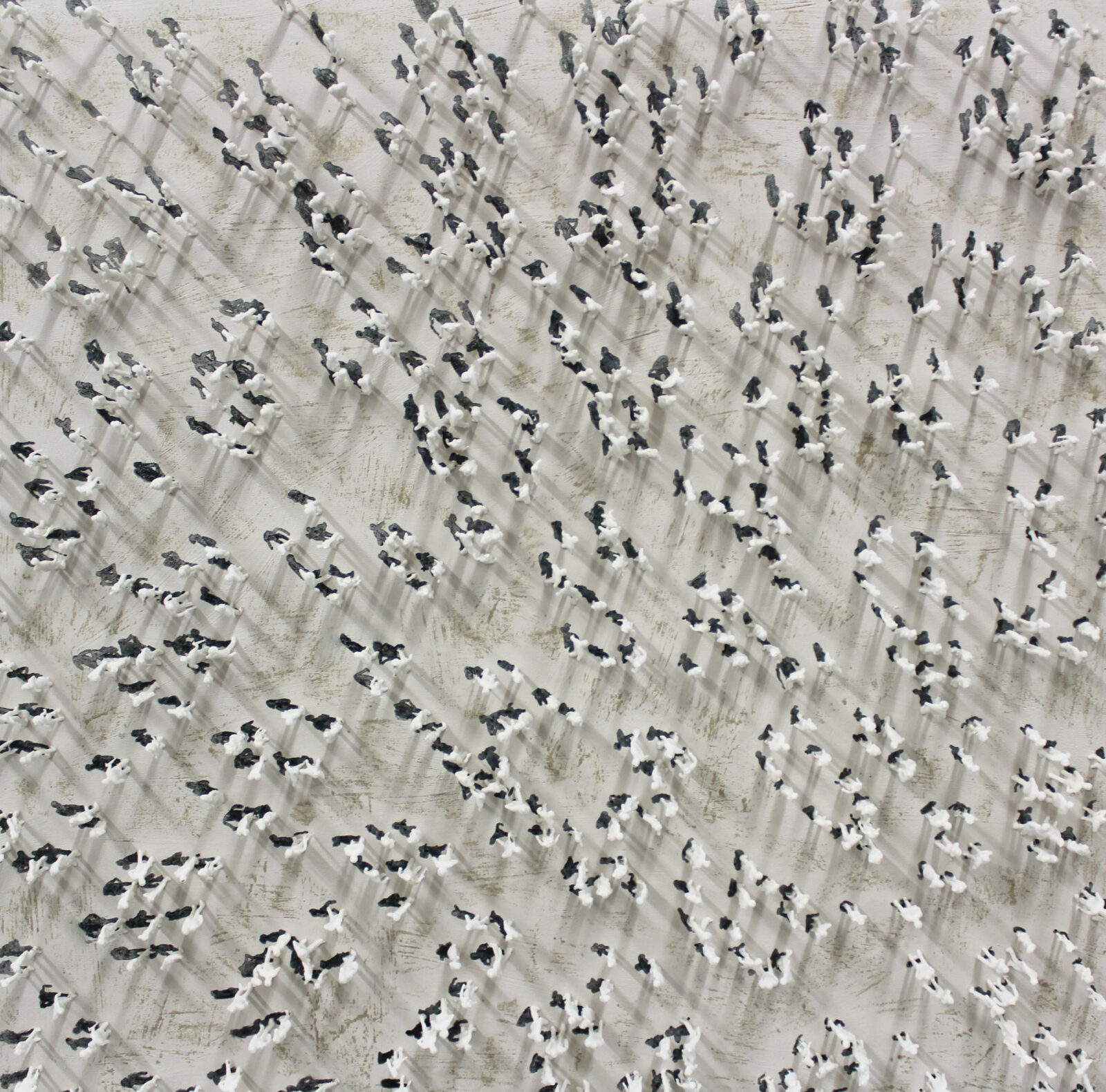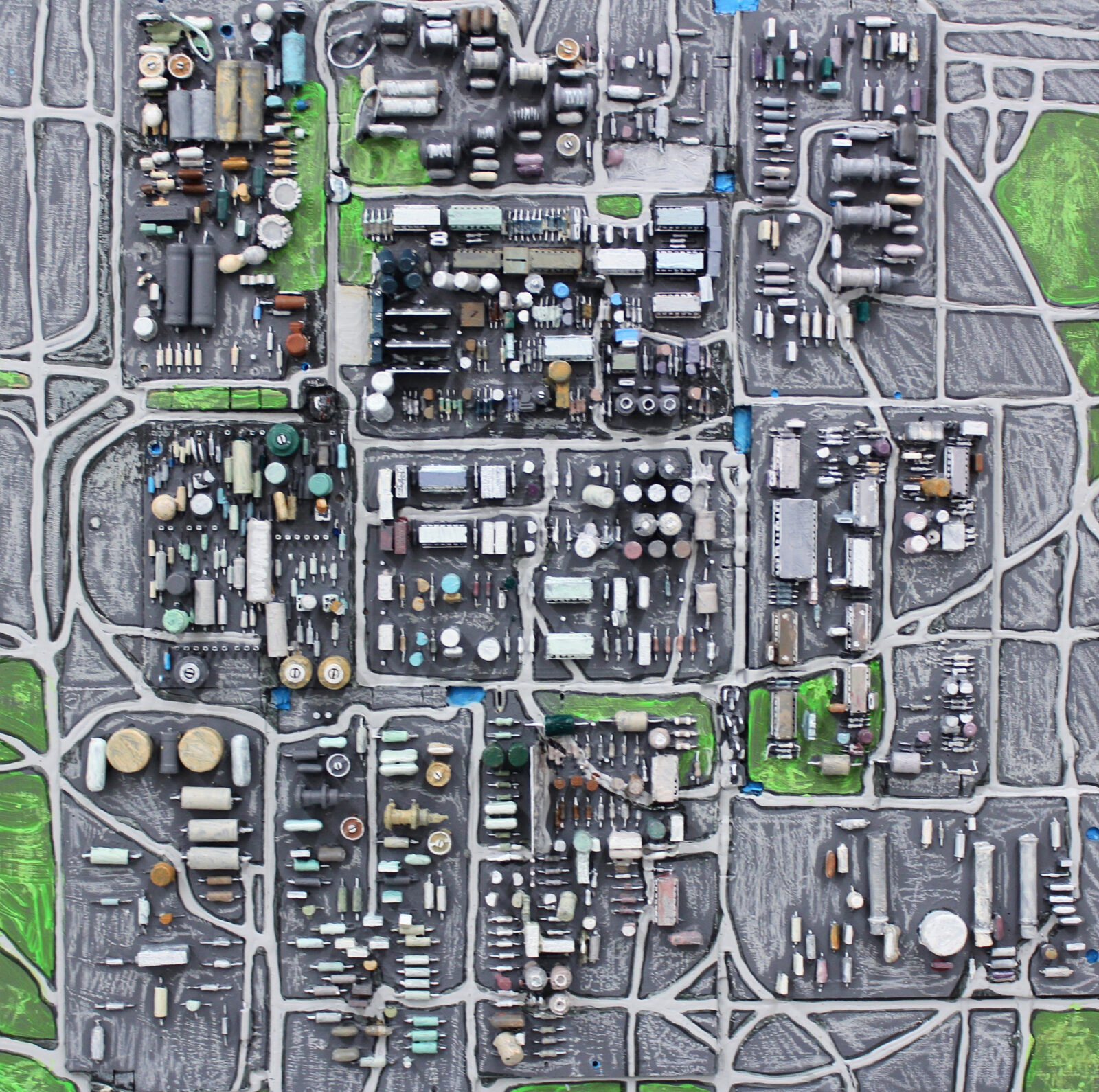 Organized Chaos is a series of mixed media depictions of populations, migrations, and urbanization from an aerial perspective. Works created using Planet Explorer Beta, an online mapping service driven by data from over a hundred CubeSat “Dove” satellites provided by Planet Labs, an Earth-imaging company. This series references the ways humans and animals self-organize forming similar patterns in behavior and order.