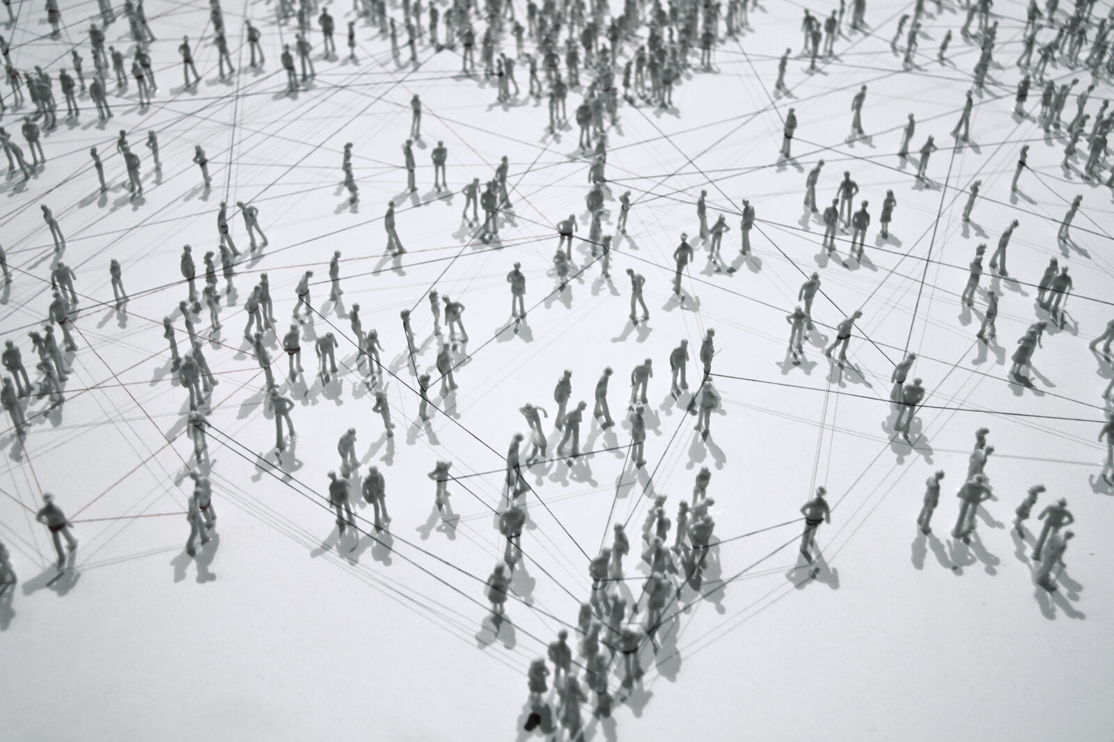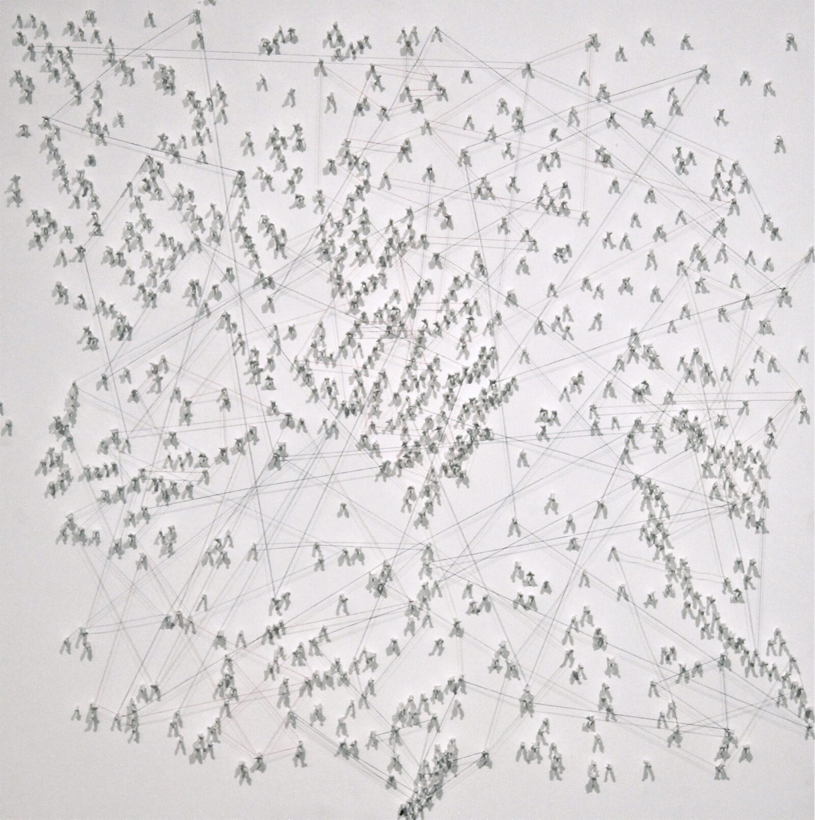 Social Ties references the theory of six degrees of separation, revealing the vast connections within communities of people. Threads interconnect clusters of people, alluding to strong and weak ties within social relationships.