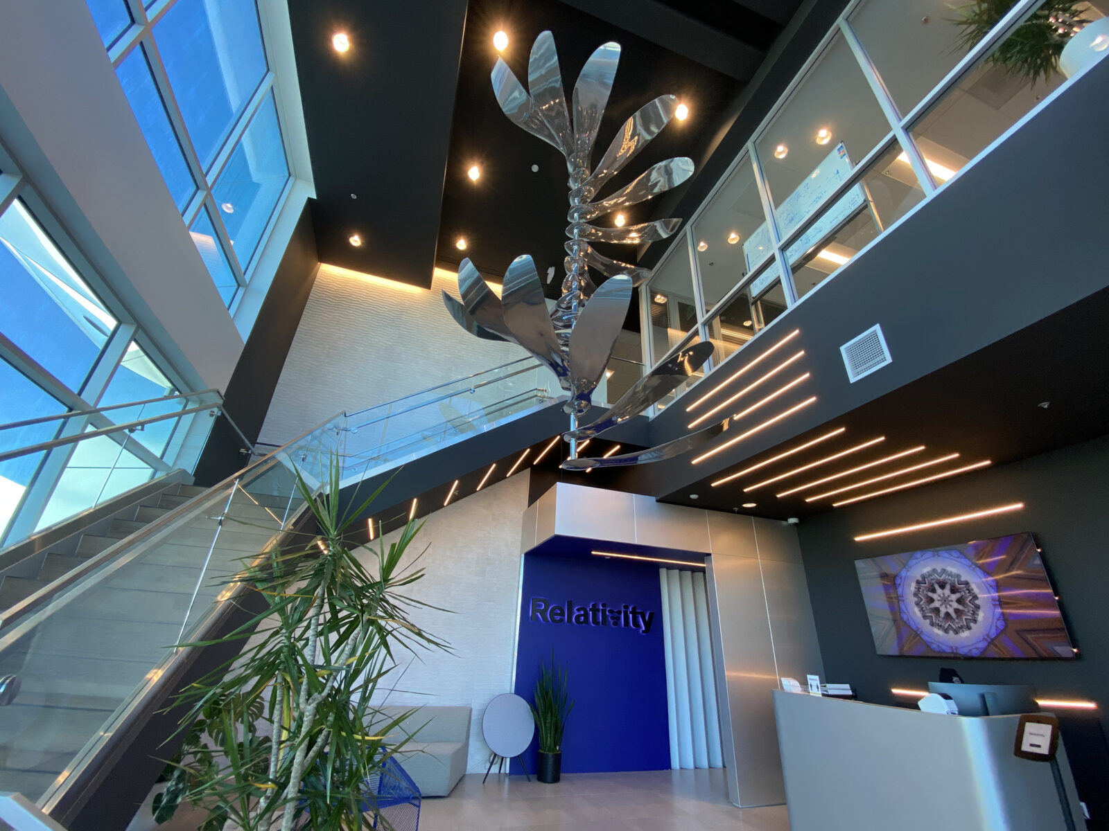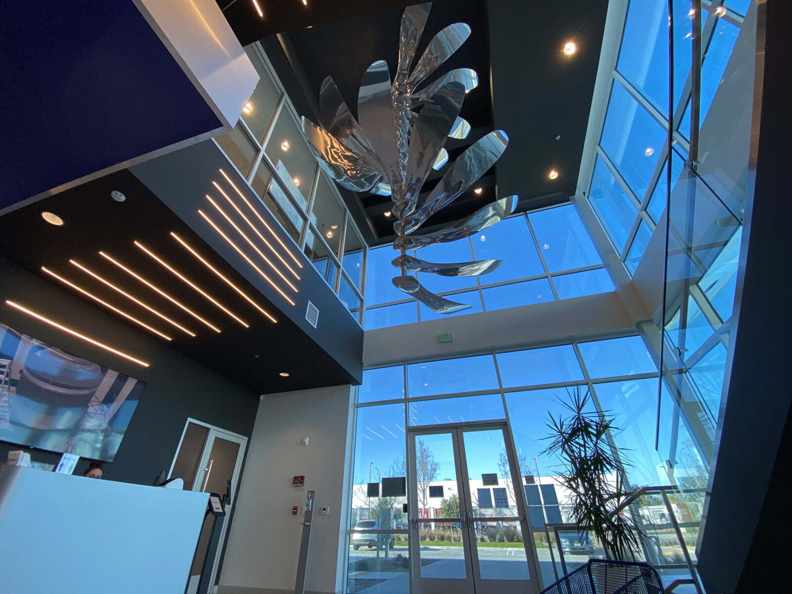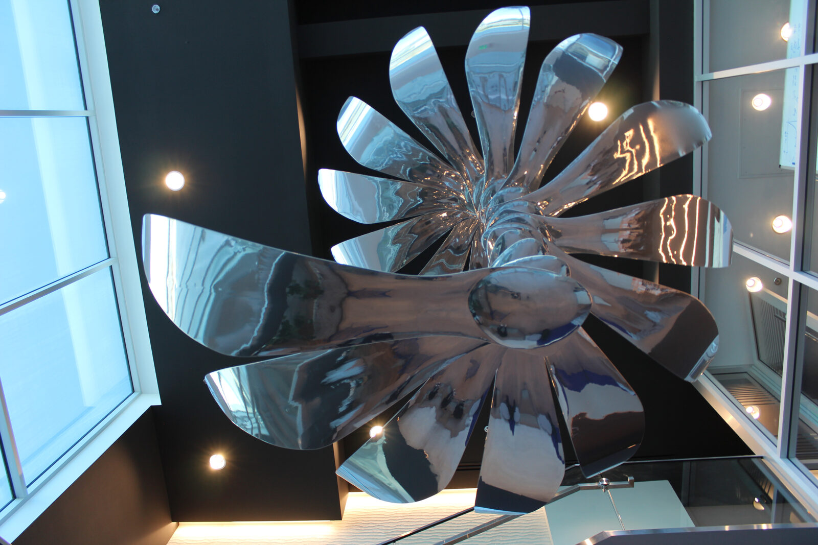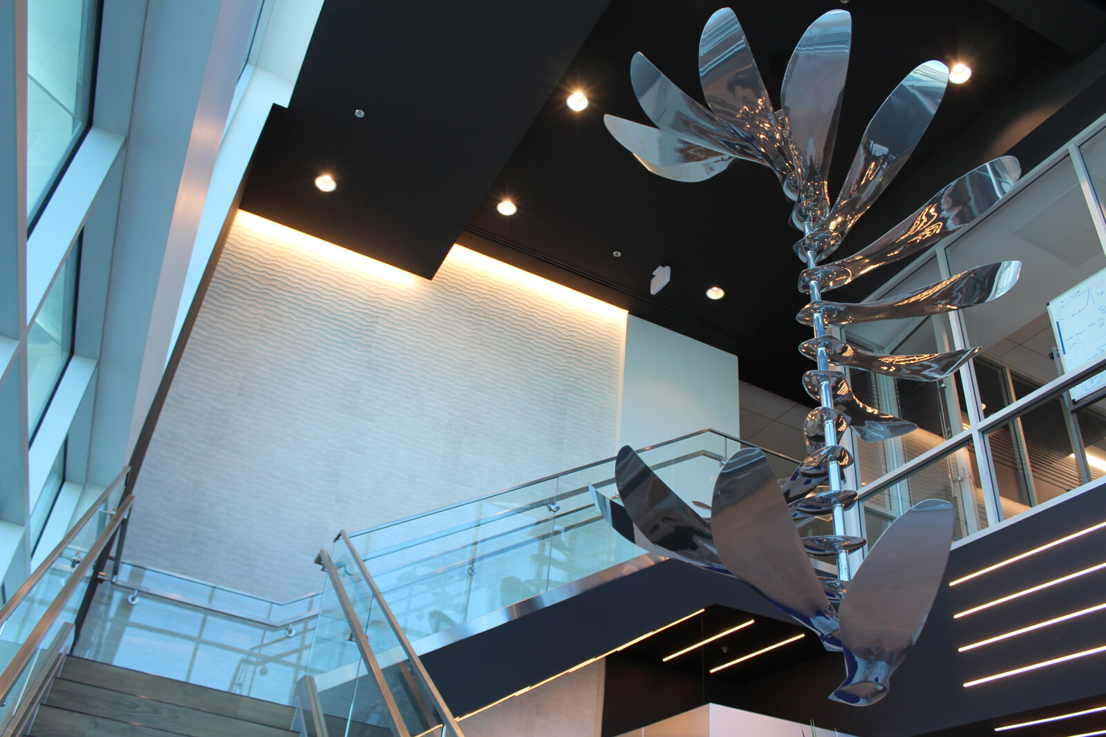 Spiral Dynamics: Flight of the Maple Seed mimics the captivating spiral flight path of a falling winged seed. This large-scale kinetic steel sculpture is based on the shape and design of a real maple seed. Each seed wing reflects the spiral pattern that emerges when a seed takes flight, referencing biomimicry used in early aviation.