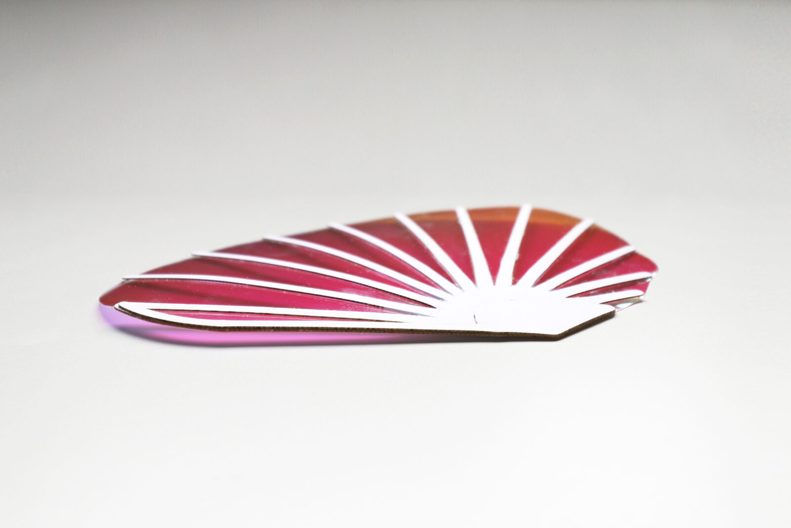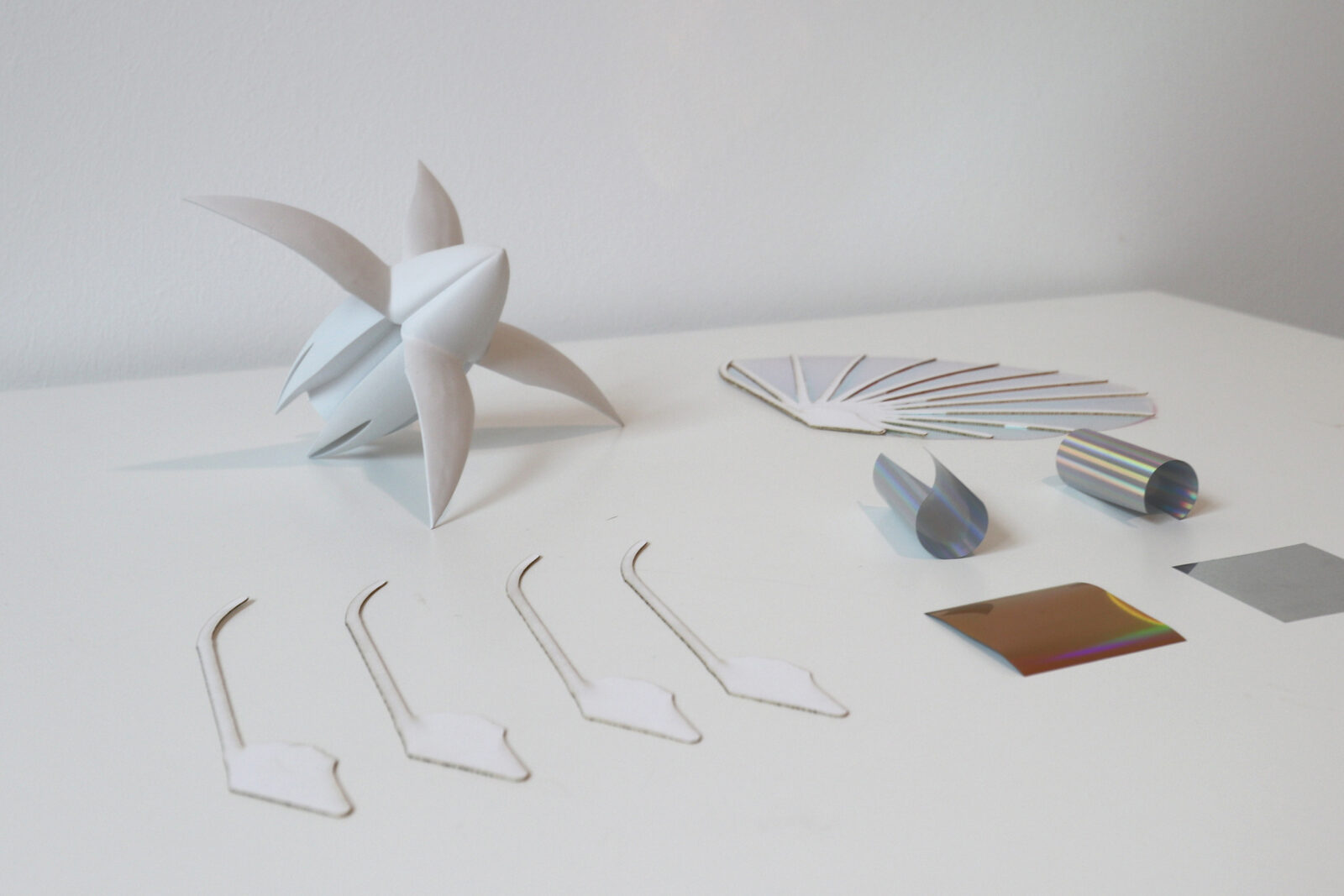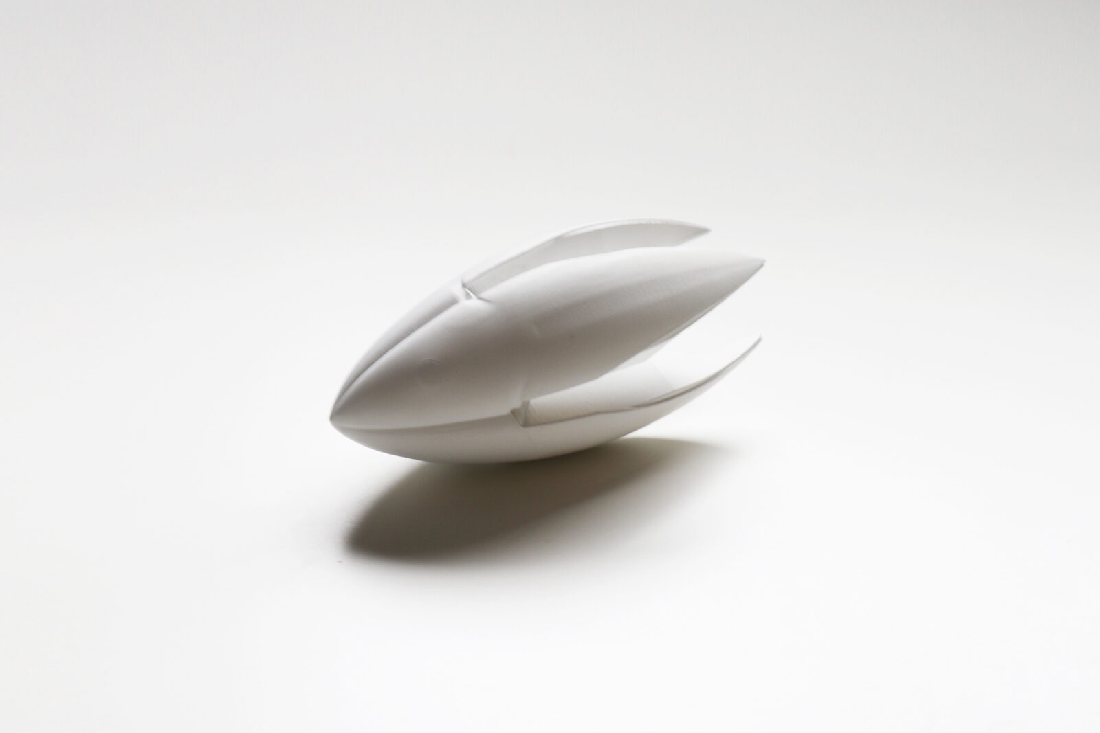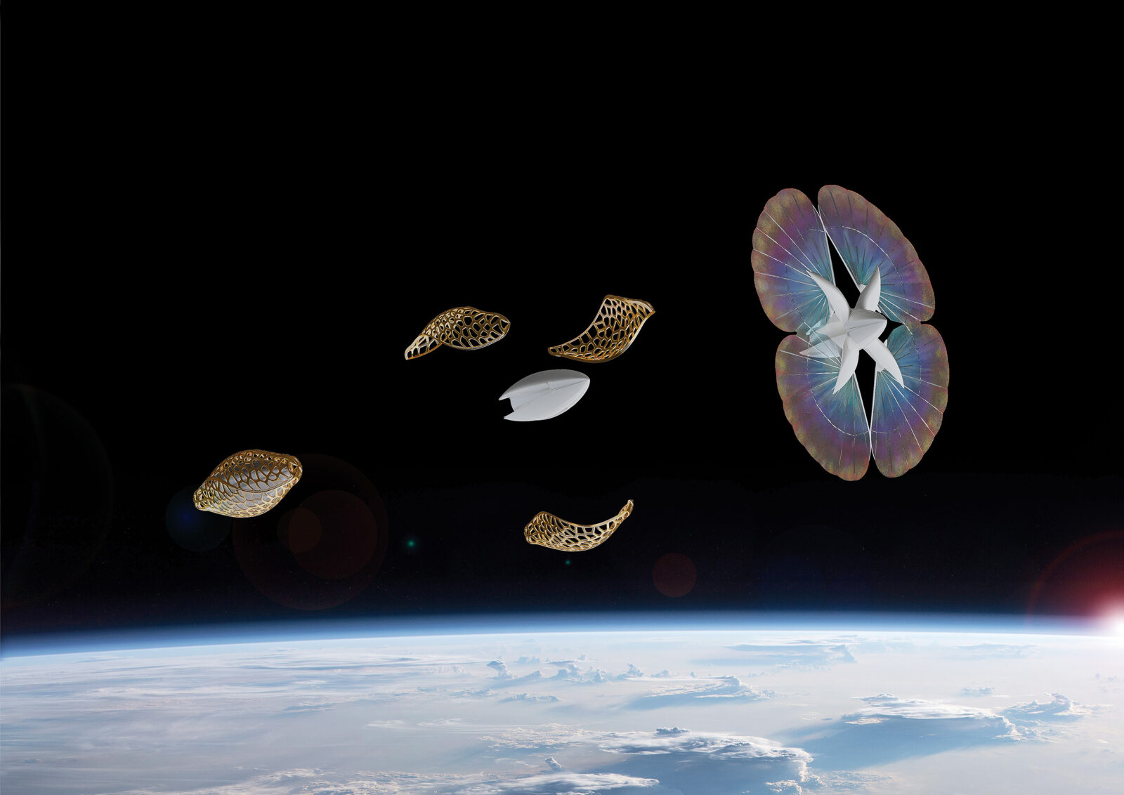 Concept drawing of vessel design to carry synthetic DNA with artwork sequenced into it into deep space. The golden moth cocoon-like space frame structure contains a sheath that holds a steel capsule of DNA within it. As the cocoon structure breaks apart once projected into space, the sheath expands open unveiling iridescent solar sails to transport the artistic message embedded in DNA into deep space. This project is still under development having undergone original prototyping and material tests. Flight mechanisms are in development as well as the spacecraft partner to send it to deep space.