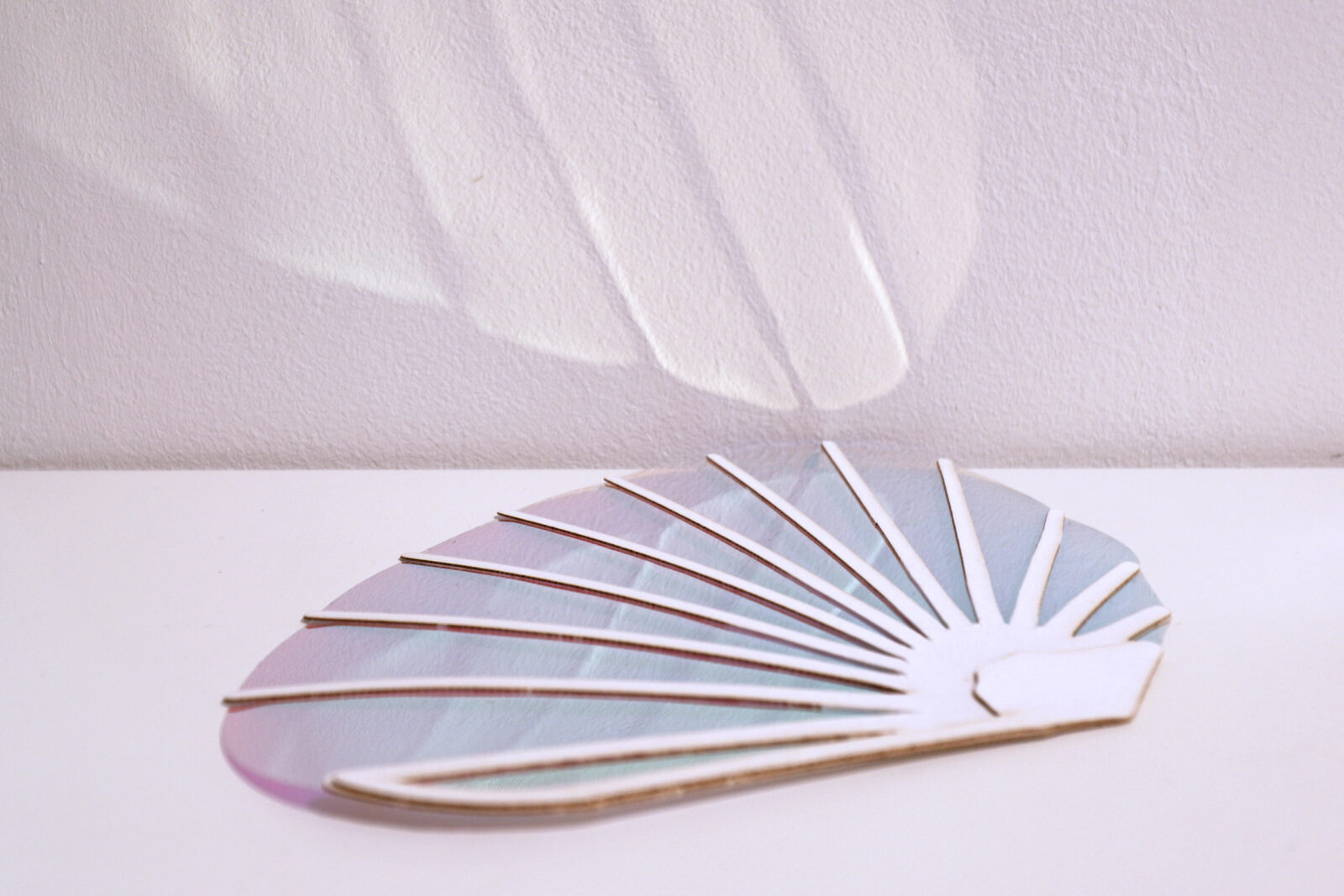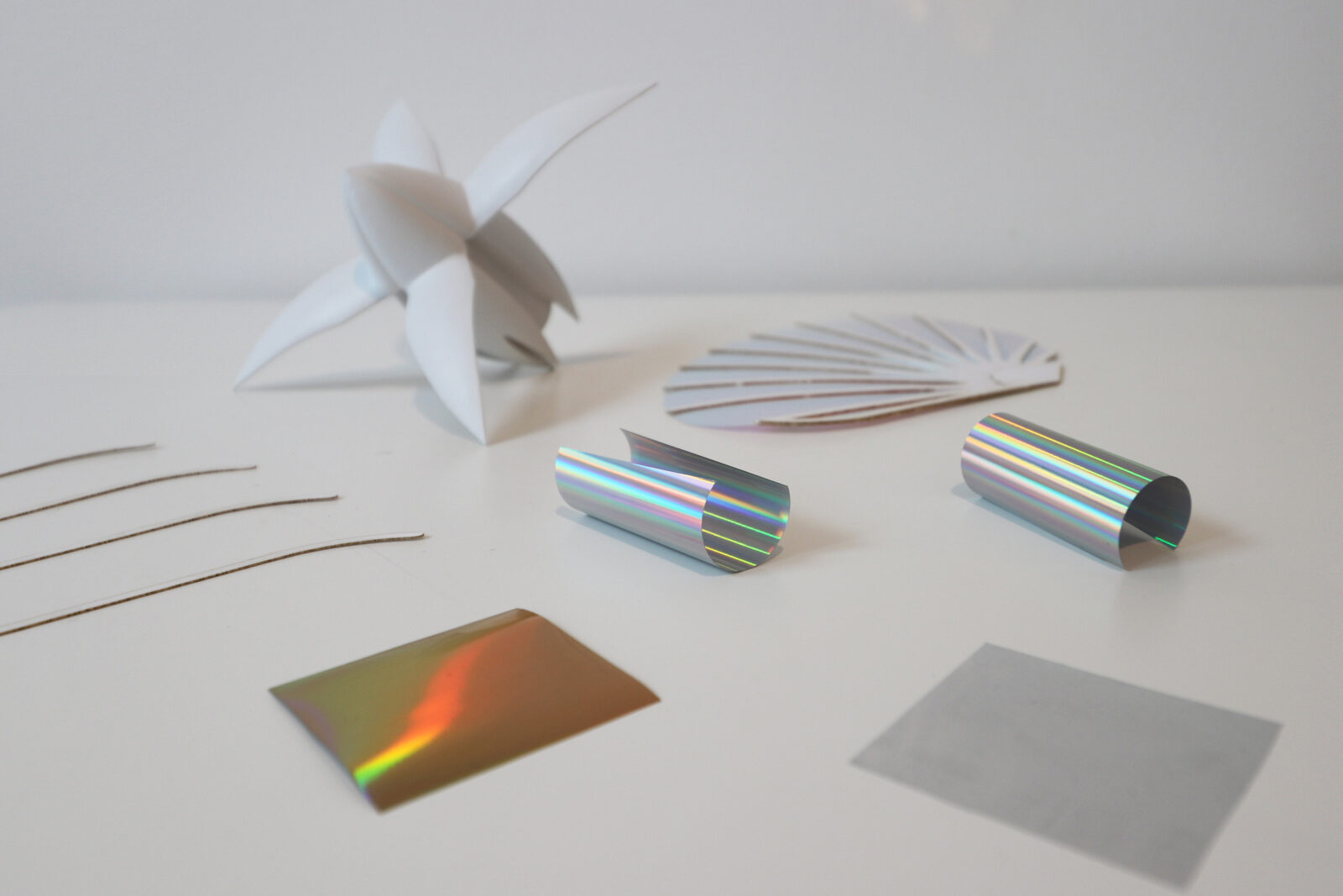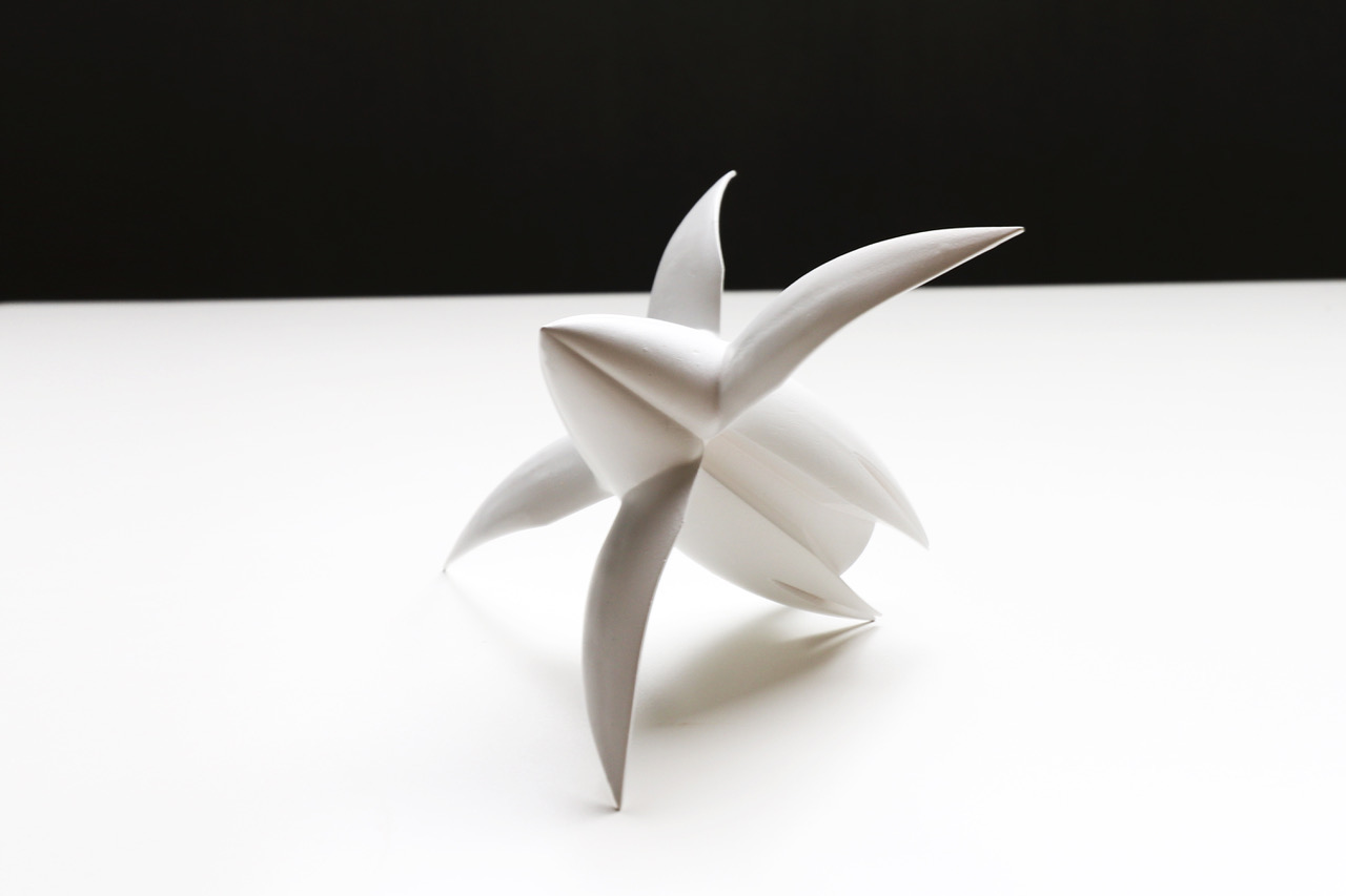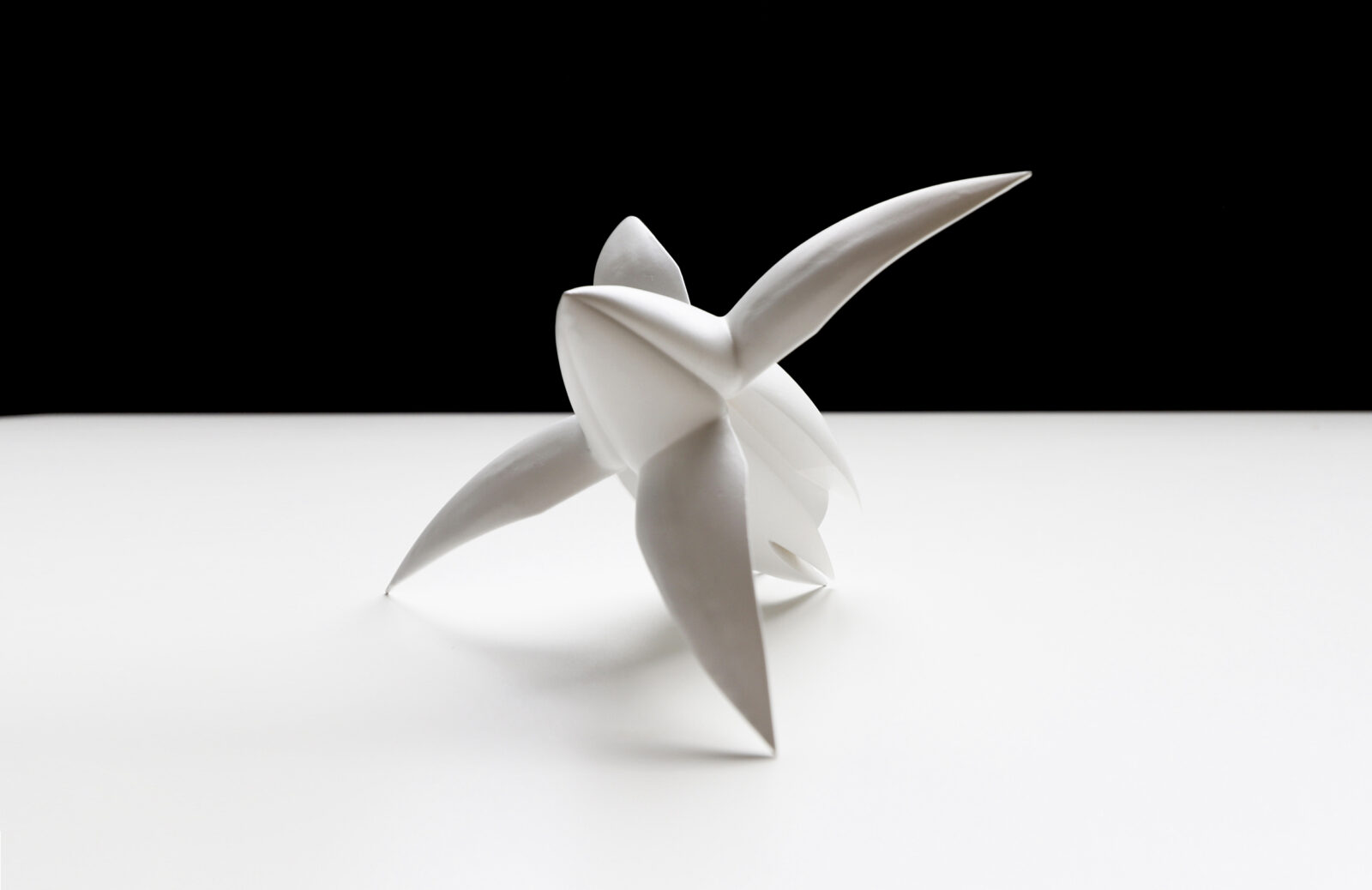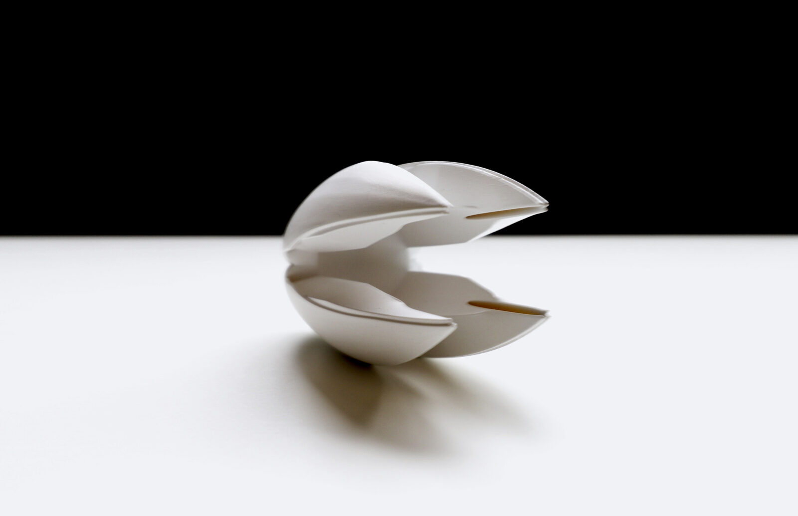 Concept drawing of vessel design to carry synthetic DNA with artwork sequenced into it into deep space. The golden moth cocoon-like space frame structure contains a sheath that holds a steel capsule of DNA within it. As the cocoon structure breaks apart once projected into space, the sheath expands open unveiling iridescent solar sails to transport the artistic message embedded in DNA into deep space. This project is still under development having undergone original prototyping and material tests. Flight mechanisms are in development as well as the spacecraft partner to send it to deep space.